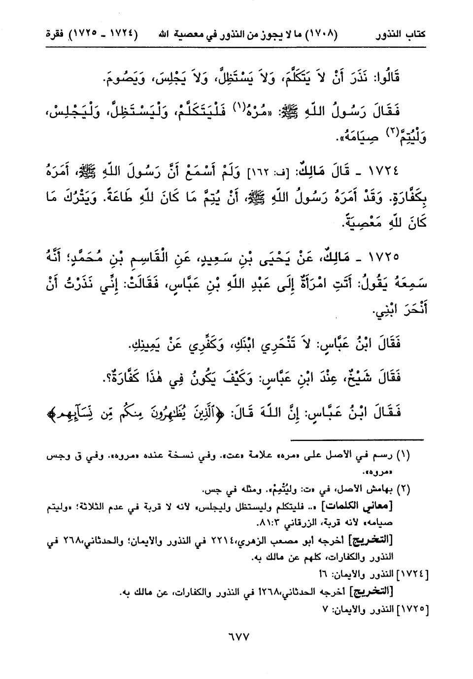 ١٧٢٤ - قَالَ مَالِكٌ: [ف: ١٦٢] وَلَمْ أَسْمَعْ أَنَّ رَسُولَ اللهِ صلى الله عليه وسلم، أَمَرَهُ بِكَفَّارَةٍ. وَقَدْ أَمَرَهُ رَسُولُ اللهِ صلى الله عليه وسلم، أَنْ يُتِمَّ مَا كَانَ للهِ طَاعَةً. وَيَتْرُكَ مَا كَانَ للهِ مَعْصِيَةً.