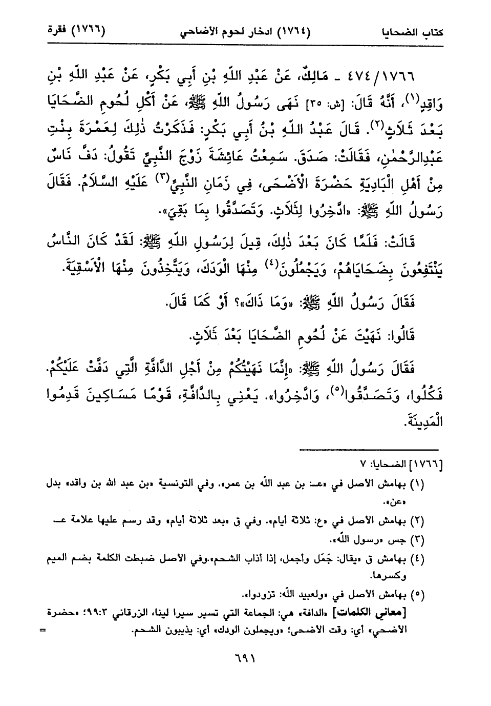 ١٧٦٦/ ٤٧٤ - مَالِكٌ، عَنْ عَبْدِ اللهِ بْنِ أَبِي بَكْرٍ، عَنْ عَبْدِ اللهِ بْنِ وَاقِدٍ (١)، أَنَّهُ قَالَ: [ش: ٣٥] نَهَى رَسُولُ اللهِ صلى الله عليه وسلم، عَنْ أَكْلِ لُحُومِ الضَّحَايَا بَعْدَ ثَلَاثٍ (٢). قَالَ عَبْدُ اللهِ بْنُ أَبِي بَكْرٍ: فَذَكَرْتُ ذلِكَ لِعَمْرَةَ بِنْتِ عَبْدِ الرَّحْمنِ، فَقَالَتْ: صَدَقَ. سَمِعْتُ عَائِشَةَ زَوْجَ النَّبِيِّ تَقُولُ: دَفَّ نَاسٌ مِنْ أَهْلِ الْبَادِيَةِ حَضْرَةَ الْأَضْحَى، فِي زَمَانِ النَّبِيِّ (٣) عَلَيْهِ السَّلَامُ. فَقَالَ رَسُولُ اللهِ صلى الله عليه وسلم: «ادَّخِرُوا لِثَلَاثٍ. وَتَصَدَّقُوا بِمَا بَقِيَ».