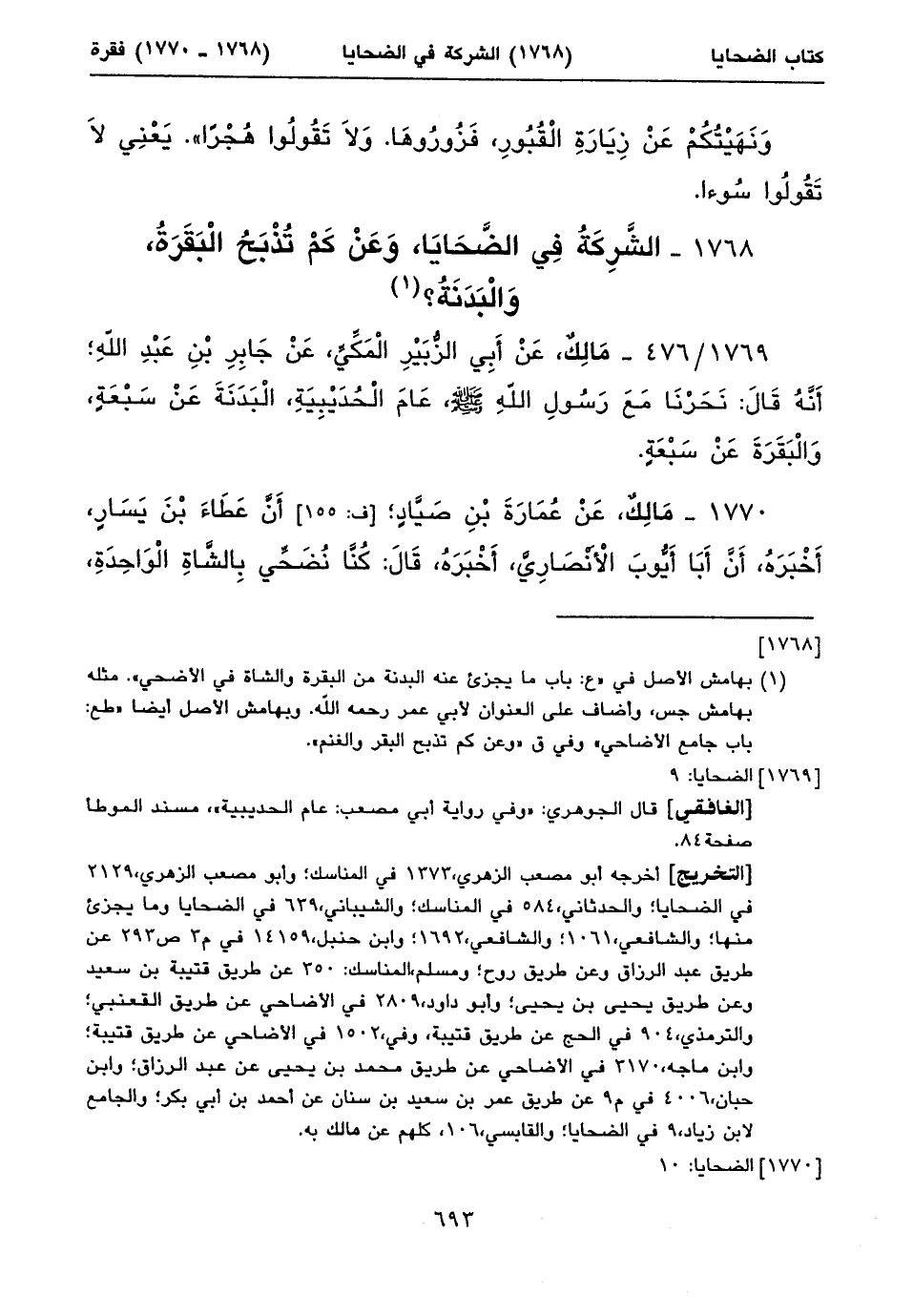 ١٧٦٩/ ٤٧٦ - مَالِكٌ، عَنْ أَبِي الزُّبَيْرِ الْمَكِّيِّ، عَنْ جَابِرِ بْنِ عَبْدِ اللهِ؛ أَنَّهُ قَالَ: نَحَرْنَا مَعَ رَسُولِ اللهِ صلى الله عليه وسلم، عَامَ الْحُدَيْبِيَةِ، الْبَدَنَةَ عَنْ سَبْعَةٍ، وَالْبَقَرَةَ عَنْ سَبْعَةٍ.