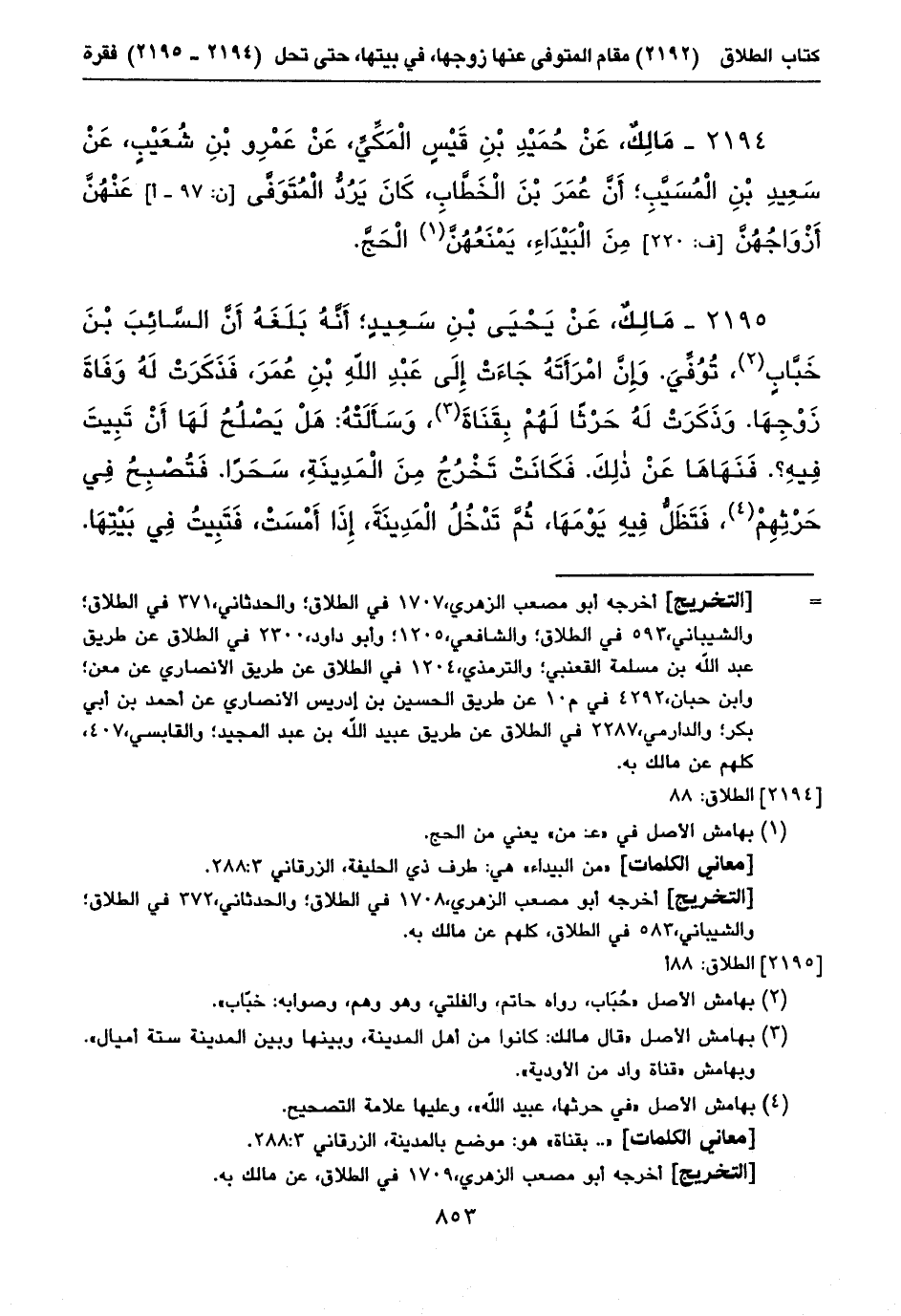 ٢١٩٤ - مَالِكٌ، عَنْ حُمَيْدِ بْنِ قَيْسٍ الْمَكِّيِّ، عَنْ عَمْرِو بْنِ شُعَيْبٍ، عَنْ سَعِيدِ بْنِ الْمُسَيَّبِ؛ أَنَّ عُمَرَ بْنَ الْخَطَّابِ، كَانَ يَرُدُّ الْمُتَوَفَّى [ن: ٩٧ - أ] عَنْهُنَّ أَزْوَاجُهُنَّ [ف: ٢٢٠] مِنَ الْبَيْدَاءِ، يَمْنَعُهُنَّ (١) الْحَجَّ.