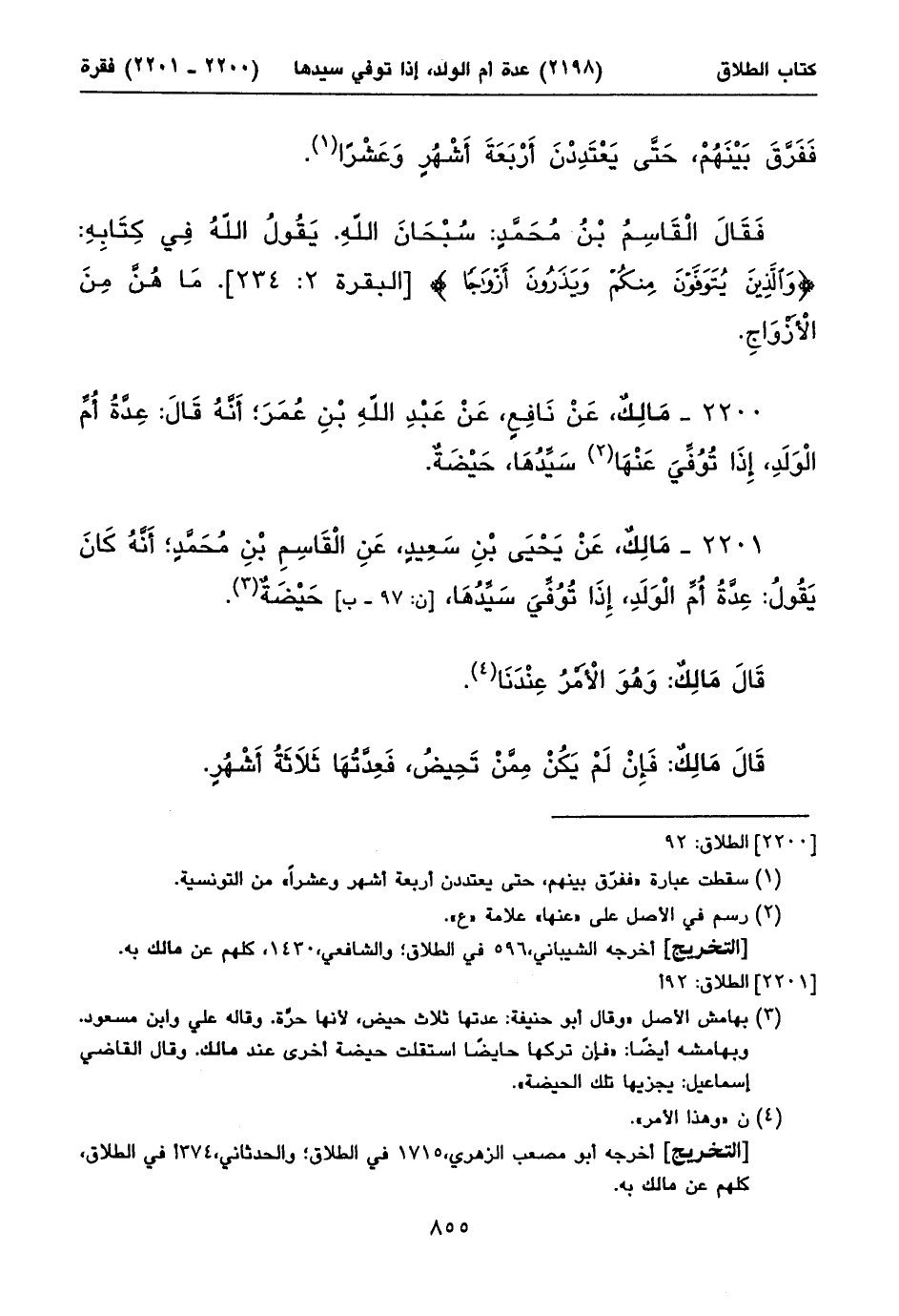 ٢٢٠١ - مَالِكٌ، عَنْ يَحْيَى بْنِ سَعِيدٍ، عَنِ الْقَاسِمِ بْنِ مُحَمَّدٍ؛ أَنَّهُ كَانَ يَقُولُ: عِدَّةُ أُمِّ الْوَلَدِ، إِذَا تُوُفِّيَ سَيِّدُهَا، [ن: ٩٧ - ب] حَيْضَةٌ (١).