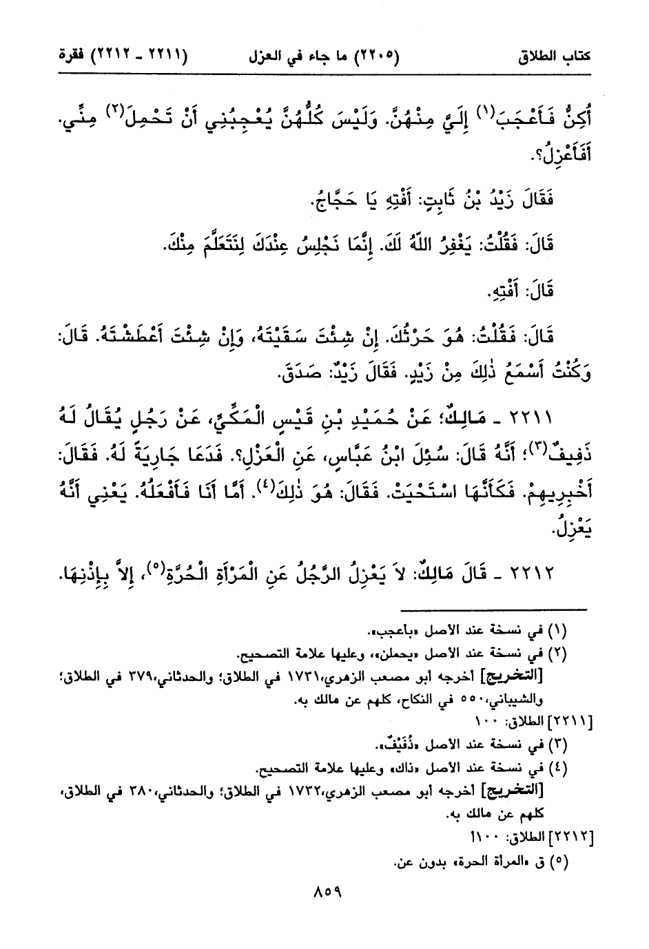 ٢٢١٢ - قَالَ مَالِكٌ: لَا يَعْزِلُ الرَّجُلُ عَنِ الْمَرْأَةِ الْحُرَّةِ (١)، إِلَاّ بِإِذْنِهَا. ⦗٨٦٠⦘ وَلَا بَأْسَ بِأَنْ يَعْزِلَ عَنْ (٢) أَمَتِهِ بِغَيْرِ إِذْنِهَا.