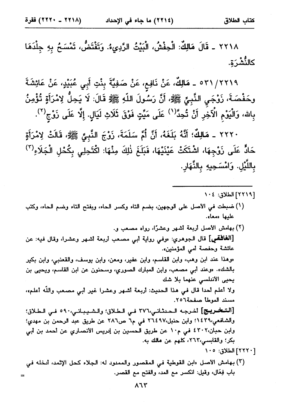 ٢٢١٩/ ٥٣١ - مَالِكٌ، عَنْ نَافِعٍ، عَنْ صَفِيَّةَ بِنْتِ أَبِي عُبَيْدٍ، عَنْ عَائِشَةَ وحَفْصَةَ، زَوْجَيِ النَّبِيِّ صلى الله عليه وسلم، أَنَّ رَسُولَ اللهِ صلى الله عليه وسلم قَالَ: لَا يَحِلُّ لِامْرَأَةٍ تُؤْمِنُ بِالله، وَالْيَوْمِ الْآخِرِ أَنْ تُحِدَّ (١) عَلَى مَيِّتٍ فَوْقَ ثَلَاثِ لَيَالٍ. إِلَاّ عَلَى زَوْجٍ (٢).