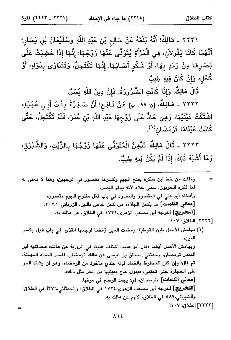 ٢٢٢١ - مَالِكٌ؛ أَنَّهُ بَلَغَهُ عَنْ سَالِمِ بْنِ عَبْدِ اللهِ وسُلَيْمَانَ بْنِ يَسَارٍ؛ أَنَّهُمَا كَانَا يَقُولَانِ، فِي الْمَرْأَةِ يُتَوَفَّى عَنْهَا زَوْجُهَا: إِنَّهَا إِذَا خَشِيَتْ عَلَى بَصَرِهَا مِنْ رَمَدٍ بِهَا، أَوْ شَكْوٍ أَصَابَهَا. إِنَّهَا تَكْتَحِلُ، وَتَتَدَاوَى بِدَوَاءٍ، أَوْ كُحْلٍ، وَإِنْ كَانَ فِيهِ طِيبٌ