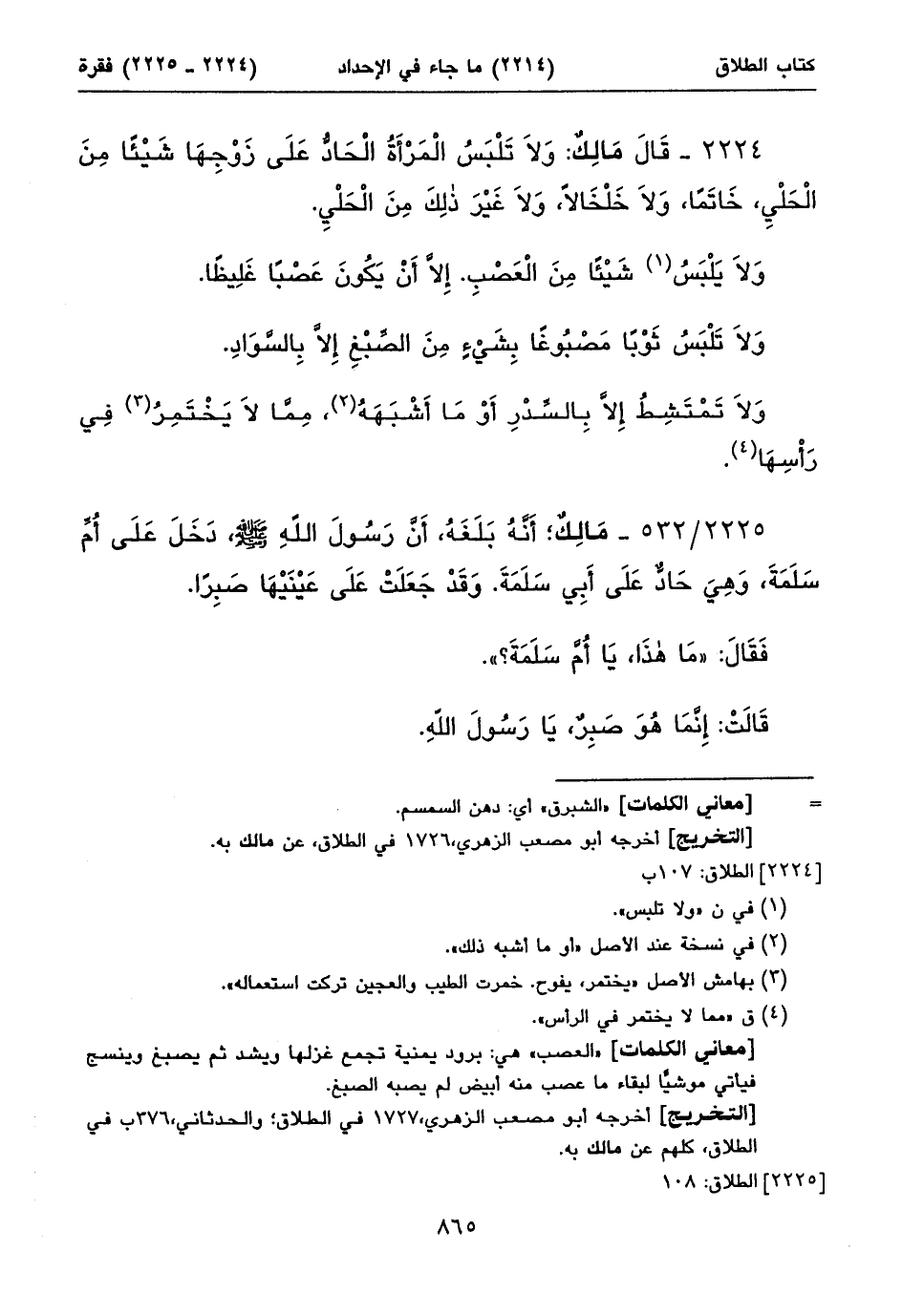 ٢٢٢٥/ ٥٣٢ - مَالِكٌ؛ أَنَّهُ بَلَغَهُ، أَنَّ رَسُولَ اللهِ صلى الله عليه وسلم، دَخَلَ عَلَى أُمِّ سَلَمَةَ، وَهِيَ حَادٌّ عَلَى أَبِي سَلَمَةَ. وَقَدْ جَعَلَتْ عَلَى عَيْنَيْهَا صَبِراً.