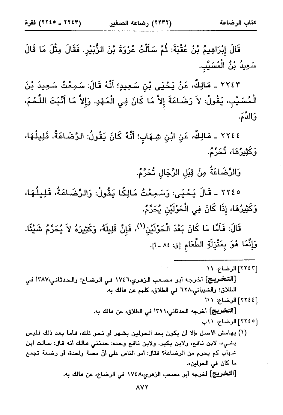 ٢٢٤٥ - قَالَ يَحْيَى: وَسَمِعْتُ مَالِكاً يَقُولُ: وَالرَّضَاعَةُ، قَلِيلُهَا، وَكَثِيرُهَا، إِذَا كَانَ فِي الْحَوْلَيْنِ يُحَرِّمُ.
