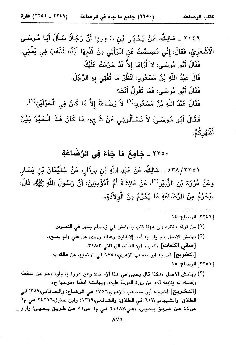 ٢٢٤٩ - مَالِكٌ، عَنْ يَحْيَى بْنِ سَعِيدٍ؛ أَنَّ رَجُلاً سَأَلَ أَبَا مُوسَى الْأَشْعَرِيَّ، فَقَالَ: إِنِّي مَصِصْتُ عَنِ امْرَأَتِي مِنْ ثَدْيِهَا لَبَناً، فَذَهَبَ فِي بَطْنِي.