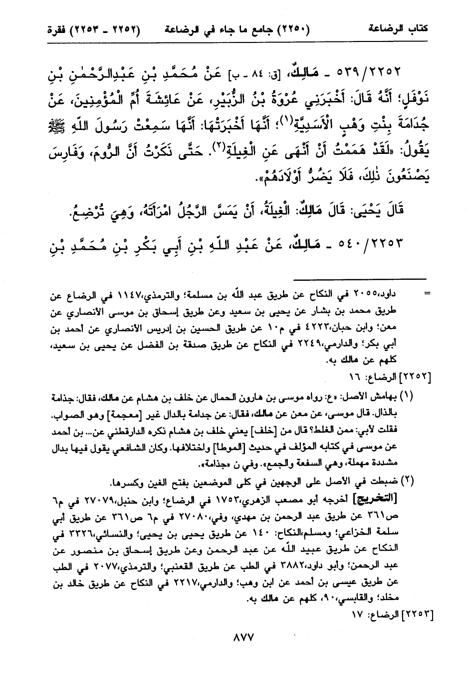 ٢٢٥٢/ ٥٣٩ - مَالِكٌ، [ق: ٨٤ - ب] عَنْ مُحَمَّدِ بْنِ عَبْدِ الرَّحْمنِ بْنِ نَوْفَلٍ؛ أَنَّهُ قَالَ: أَخْبَرَنِي عُرْوَةُ بْنُ الزُّبَيْرِ، عَنْ عَائِشَةَ أُمِّ الْمُؤْمِنِينَ، عَنْ جُدَامَةَ بِنْتِ وَهْبٍ الْأَسَدِيَّةِ (١)؛ أَنَّهَا أَخْبَرَتْهَا: أَنَّهَا سَمِعْتْ رَسُولَ اللهِ صلى الله عليه وسلم يَقُولُ: «لَقَدْ هَمَمْتُ أَنْ أَنْهَى عَنِ الْغِيلَةِ (٢). حَتَّى ذَكَرْتُ أَنَّ الرُّومَ، وَفَارِسَ يَصْنَعُونَ ذلِكَ، فَلَا يَضُرُّ أَوْلَادَهُمْ».
