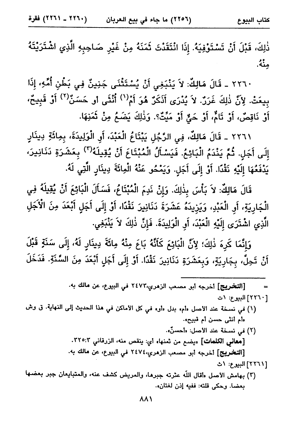 ٢٢٦٠ - قَالَ مَالِكٌ: لَا يَنْبَغِي أَنْ يُسْتَثْنَى جَنِينٌ فِي بَطْنِ أُمِّهِ، إِذَا بِيعَتْ. لِأَنَّ ذلِكَ غَرَرٌ. لَا يُدْرَى أَذَكَرٌ هُوَ أَمْ (١) أُنْثَى أو حَسَنٌ (٢) أَوْ قَبِيحٌ، أَوْ نَاقِصٌ، أَوْ تَامٌّ، أَوْ حَيٌّ أَوْ مَيِّتٌ؟. وَذلِكَ يَضَعُ مِنْ ثَمَنِهَا.