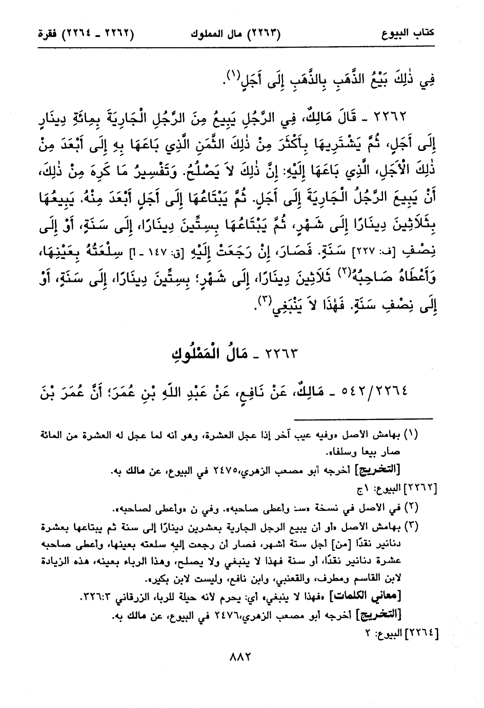 ٢٢٦٤/ ٥٤٢ - مَالِكٌ، عَنْ نَافِعٍ، عَنْ عَبْدِ اللهِ بْنِ عُمَرَ؛ أَنَّ عُمَرَ بْنَ ⦗٨٨٣⦘ الْخَطَّابِ، قَالَ: مَنْ بَاعَ عَبْداً، وَلَهُ مَالٌ. فَمَالُهُ لِلْبَائِعِ. إِلَاّ أَنْ يَشْتَرِطَهُ (١) الْمُبْتَاعُ.