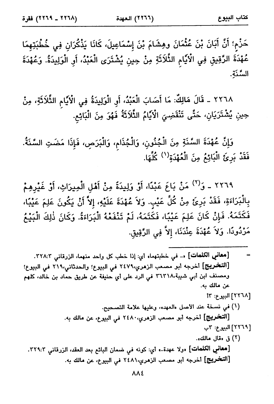 ٢٢٦٩ - وَ (١) مَنْ بَاعَ عَبْداً، أَوْ وَلِيدَةً مِنْ أَهْلِ الْمِيرَاثِ، أَوْ غَيْرِهِمْ بِالْبَرَاءَةِ، فَقَدْ بَرِئَ مِنْ كُلِّ عَيْبٍ. وَلَا عُهْدَةَ عَلَيْهِ، إِلَاّ أَنْ يَكُونَ عَلِمَ عَيْباً، فَكَتَمَهُ. فَإِنْ كَانَ عَلِمَ عَيْباً، فَكَتَمَهُ، لَمْ تَنْفَعْهُ الْبَرَاءَةُ. وَكَانَ ذلِكَ الْبَيْعُ مَرْدُوداً. وَلَا عُهْدَةَ عِنْدَنَا، إِلَاّ فِي الرَّقِيقِ.