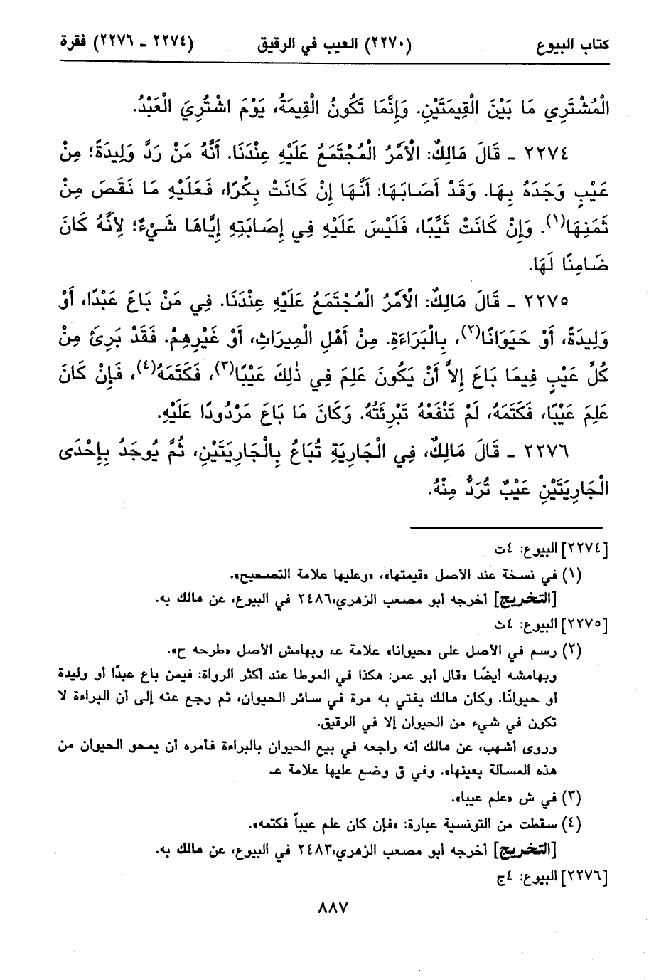 وبهامشه أيضاً «قال أبو عمر: هكذا في الموطأ عند أكثر الرواة: فيمن باع عبداً أو وليدة أو حيواناً. وكان مالك يفتي به مرة في سائر الحيوان، ثم رجع عنه إلى أن البراءة لا تكون في شيء من الحيوان إلا في الرقيق.