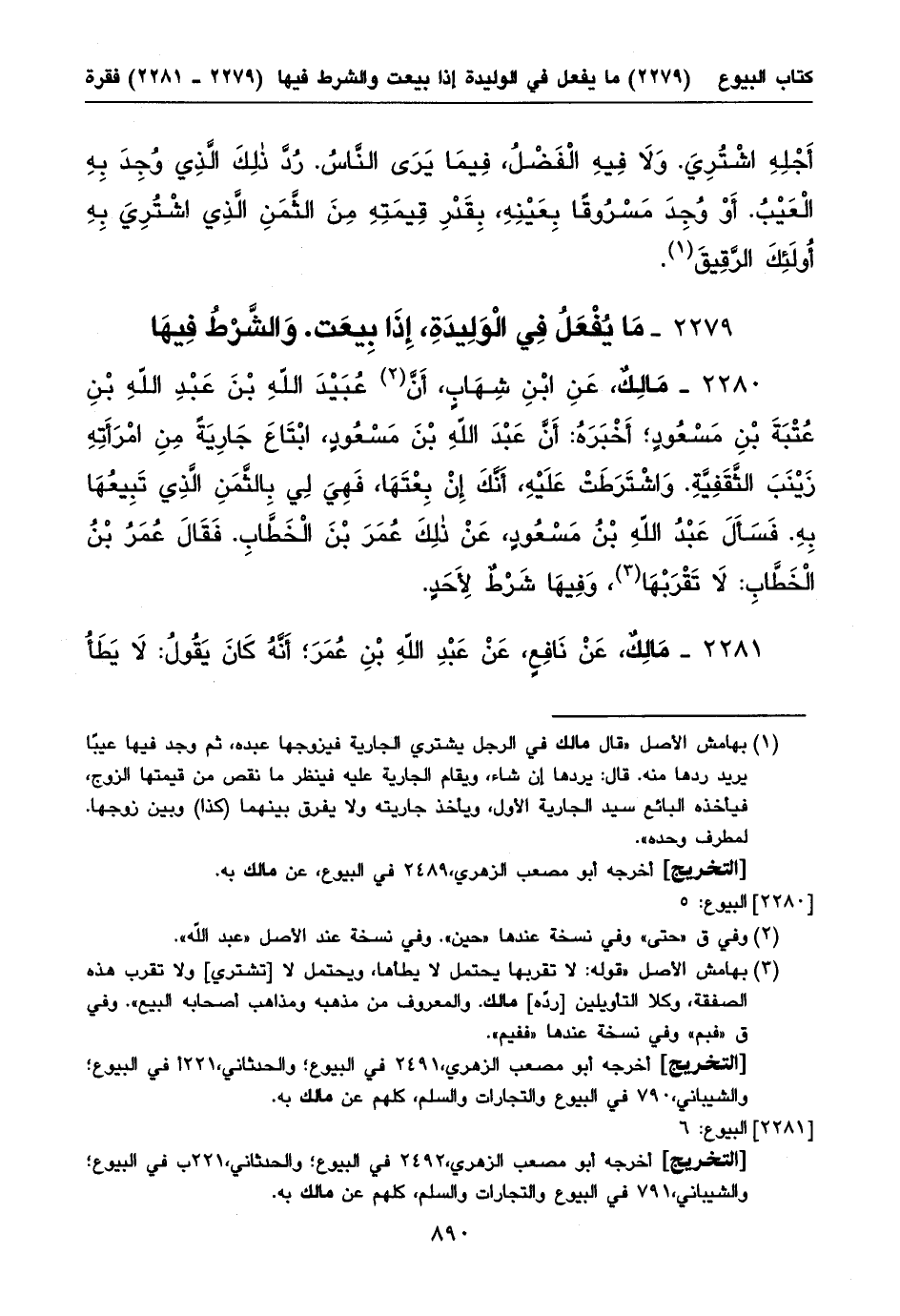٢٢٨٠ - مَالِكٌ، عَنِ ابْنِ شِهَابٍ، أَنَّ (١) عُبَيْدَ اللهِ بْنَ عَبْدِ اللهِ بْنِ عُتْبَةَبْنِ مَسْعُودٍ؛ أَخْبَرَهُ: أَنَّ عَبْدَ اللهِ بْنَ مَسْعُودٍ، ابْتَاعَ جَارِيَةً مِنِ امْرَأَتِهِ زَيْنَبَ الثَّقَفِيَّةِ. وَاشْتَرَطَتْ عَلَيْهِ، أَنَّكَ إِنْ بِعْتَهَا، فَهِيَ لِي بِالثَّمَنِ الَّذِي تَبِيعُهَا بِهِ. فَسَأَلَ عَبْدُ اللهِ بْنُ مَسْعُودٍ، عَنْ ذلِكَ عُمَرَ بْنَ الْخَطَّابِ. فَقَالَ عُمَرُ بْنُ الْخَطَّابِ: لَا تَقْرَبْهَا (٢)، وَفِيهَا شَرْطٌ لِأَحَدٍ.