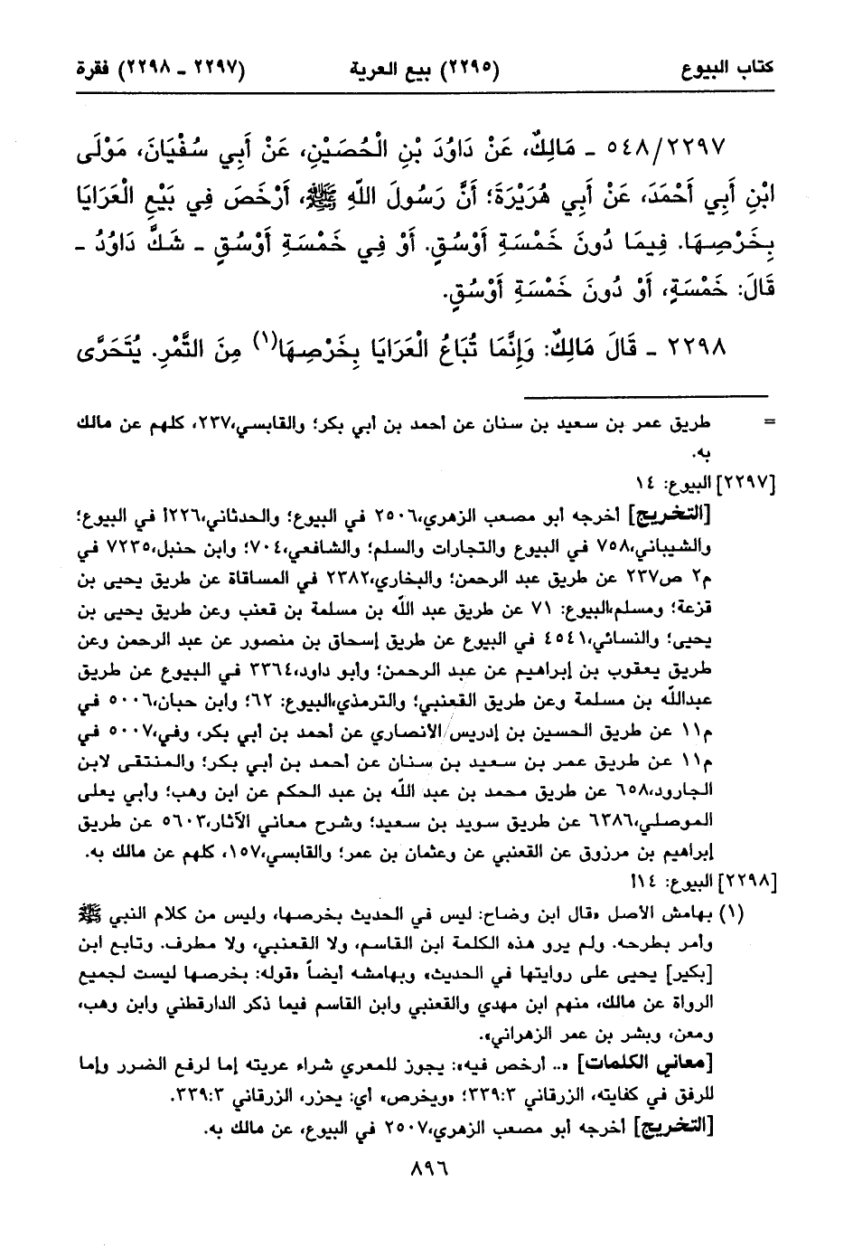 أخرجه أبو مصعب الزهري، ٢٥٠٦ في البيوع؛ والحدثاني، ٢٢٦أفي البيوع؛ والشيباني، ٧٥٨ في البيوع والتجارات والسلم؛ والشافعي، ٧٠٤؛ وابن حنبل، ٧٢٣٥ في م٢ ص٢٣٧ عن طريق عبد الرحمن؛ والبخاري، ٢٣٨٢ في المساقاة عن طريق يحيى بن قزعة؛ ومسلم، البيوع: ٧١ عن طريق عبد الله بن مسلمة بن قعنب وعن طريق يحيى بن يحيى؛ والنسائي، ٤٥٤١ في البيوع عن طريق إسحاق بن منصور عن عبد الرحمن وعن طريق يعقوب بن إبراهيم عن عبد الرحمن؛ وأبو داود، ٣٣٦٤ في البيوع عن طريق عبد اللهبن مسلمة وعن طريق القعنبي؛ والترمذي، البيوع: ٦٢؛ وابن حبان، ٥٠٠٦ في م١١ عن طريق الحسين بن إدريس الأنصاري عن أحمد بن أبي بكر، وفي، ٥٠٠٧ في م١١ عن طريق عمر بن سعيد بن سنان عن أحمد بن أبي بكر؛ والمنتقى لابن الجارود، ٦٥٨ عن طريق محمد بن عبد الله بن عبد الحكم عن ابن وهب؛ وأبي يعلى الموصلي، ٦٣٨٦ عن طريق سويد بن سعيد؛ وشرح معاني الآثار، ٥٦٠٣ عن طريق إبراهيم بن مرزوق عن القعنبي عن وعثمان بن عمر؛ والقابسي، ١٥٧، كلهم عن مالك به.
