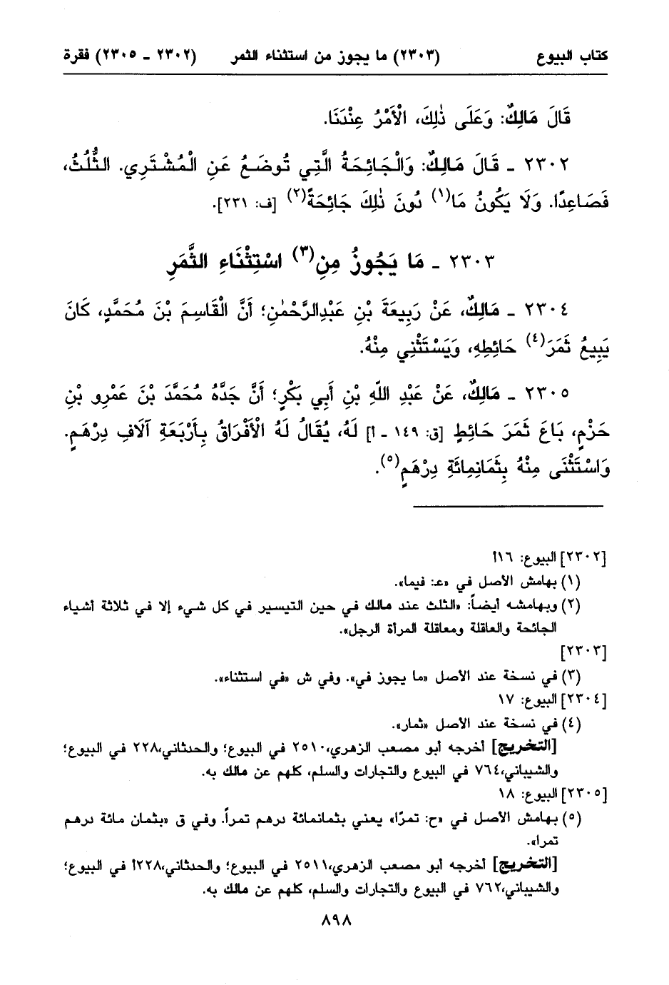 ٢٣٠٥ - مَالِكٌ، عَنْ عَبْدِ اللهِ بْنِ أَبِي بَكْرٍ؛ أَنَّ جَدَّهُ مُحَمَّدَ بْنَ عَمْرِوبْنِ حَزْمٍ، بَاعَ ثَمَرَ حَائِطٍ [ق: ١٤٩ - أ] لَهُ، يُقَالُ لَهُ الْأَفْرَاقُ بِأَرْبَعَةِ آلَافِ دِرْهَمٍ. وَاسْتَثْنَى مِنْهُ بِثَمَانِمِائَةِ دِرْهَمٍ (١).