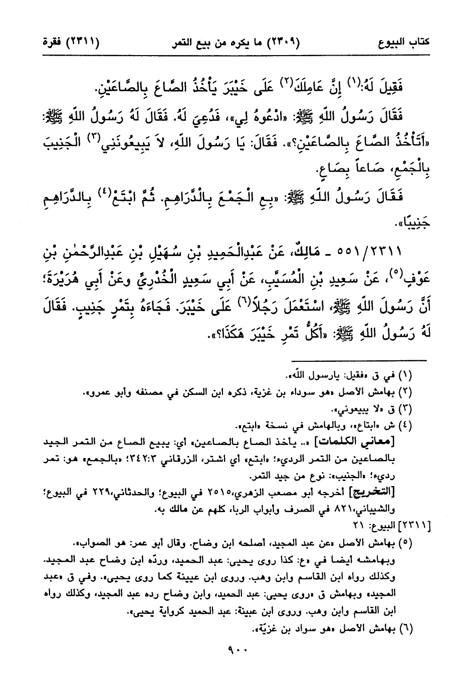 ٢٣١١/ ٥٥١ - مَالِكٌ، عَنْ عَبْدِ الْحَمِيدِ بْنِ سُهَيْلِ بْنِ عَبْدِ الرَّحْمنِ بْنِ عَوْفٍ (١)، عَنْ سَعِيدِ بْنِ الْمُسَيَّبِ، عَنْ أَبِي سَعِيدٍ الْخُدْرِيِّ وعَنْ أَبِي هُرَيْرَةَ؛ أَنَّ رَسُولَ اللهِ صلى الله عليه وسلم، اسْتَعْمَلَ رَجُلاً (٢) عَلَى خَيْبَرَ. فَجَاءَهُ بِتَمْرٍ جَنِيبٍ. فَقَالَ لَهُ رَسُولُ اللهِ صلى الله عليه وسلم: «أَكُلُّ تَمْرِ خَيْبَرَ هَكَذَا؟». ⦗٩٠١⦘
