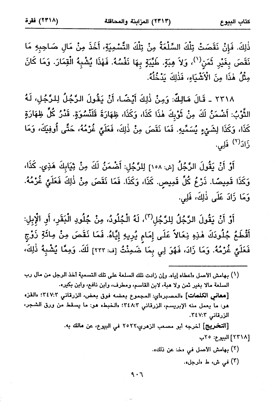 ٢٣١٨ - قَالَ مَالِكٌ: وَمِنْ ذلِكَ أَيْضاً، أَنْ يَقُولَ الرَّجُلُ لِلرَّجُلِ، لَهُ الثَّوْبُ: أَضْمَنُ لَكَ مِنْ ثَوْبِكَ هذَا كَذَا، وَكَذَا، ظِهَارَةَ قَلَنْسُوَةٍ. قَدْرُ كُلِّ ظِهَارَةٍ كَذَا، وَكَذَا لِشَيْءٍ يُسَمِّيهِ. فَمَا نَقَصَ مِنْ ذلِكَ، فَعَلَيَّ غُرْمُهُ، حَتَّى أُوفِيَكَ، وَمَا زَادَ (١) فَلِي.