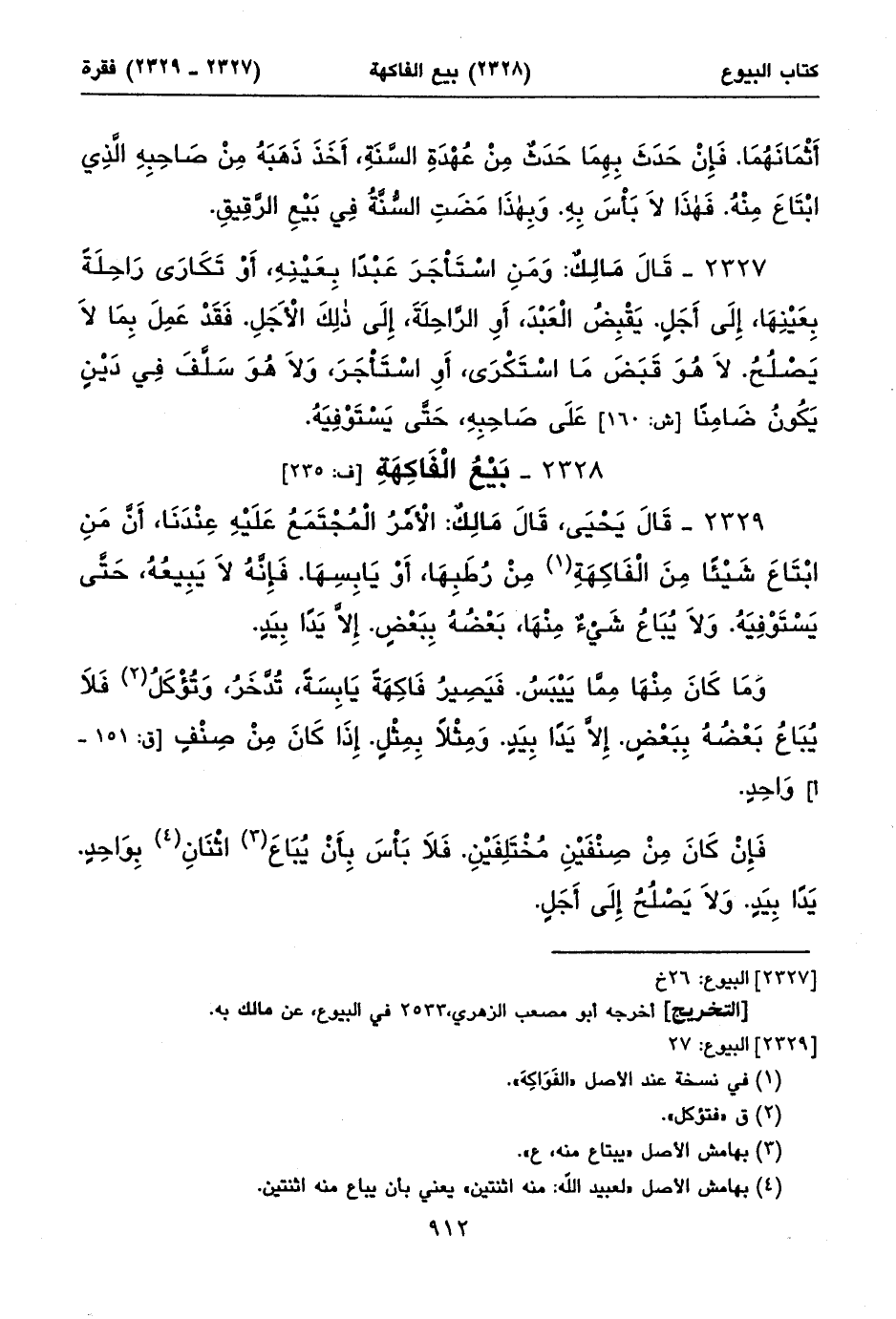 ٢٣٢٩ - قَالَ يَحْيَى، قَالَ مَالِكٌ: الْأَمْرُ الْمُجْتَمَعُ عَلَيْهِ عِنْدَنَا، أَنَّ مَنِ ابْتَاعَ شَيْئاً مِنَ الْفَاكِهَةِ (١) مِنْ رُطَبِهَا، أَوْ يَابِسِهَا. فَإِنَّهُ لَا يَبِيعُهُ، حَتَّى يَسْتَوْفِيَهُ. وَلَا يُبَاعُ شَيْءٌ مِنْهَا، بَعْضُهُ بِبَعْضٍ. إِلَاّ يَداً بِيَدٍ.