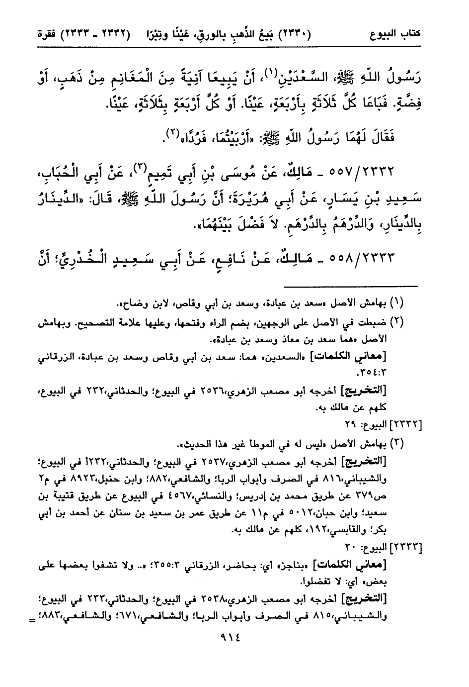 ٢٣٣٣/ ٥٥٨ - مَالِكٌ، عَنْ نَافِعٍ، عَنْ أَبِي سَعِيدٍ الْخُدْرِيِّ؛ أَنَّ ⦗٩١٥⦘ رَسُولَ اللهِ صلى الله عليه وسلم، قَالَ: «لَا تَبِيعُوا الذَّهَبَ بِالذَّهَبِ. إِلَاّ مِثْلاً بِمِثْلٍ. وَلَا تُشِفُّوا بَعْضَهَا عَلَى بَعْضٍ.