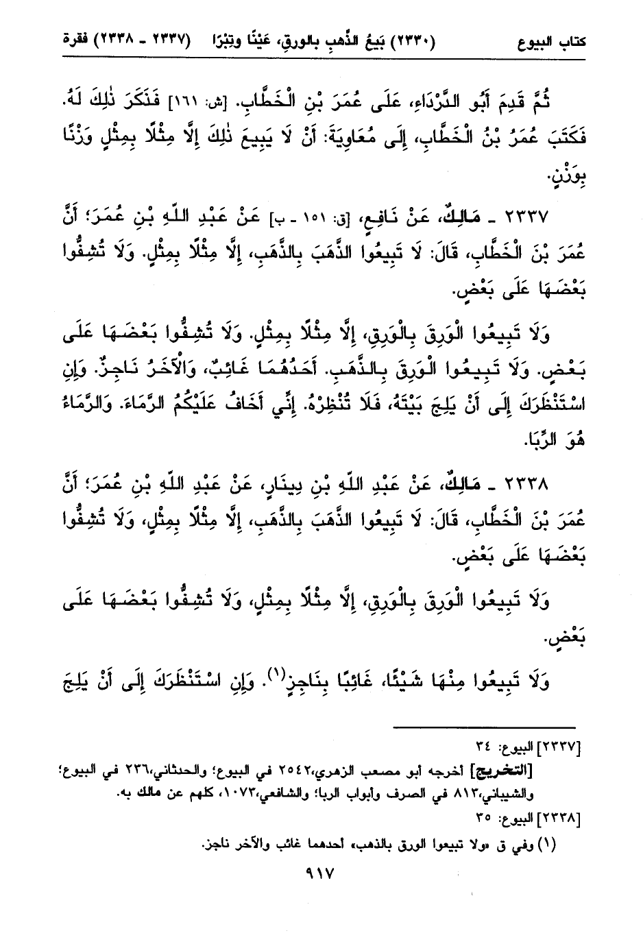 ٢٣٣٧ - مَالِكٌ، عَنْ نَافِعٍ، [ق: ١٥١ - ب] عَنْ عَبْدِ اللهِ بْنِ عُمَرَ؛ أَنَّ عُمَرَ بْنَ الْخَطَّابِ، قَالَ: لَا تَبِيعُوا الذَّهَبَ بِالذَّهَبِ، إِلَاّ مِثْلاً بِمِثْلٍ. وَلَا تُشِفُّوا بَعْضَهَا عَلَى بَعْضٍ.