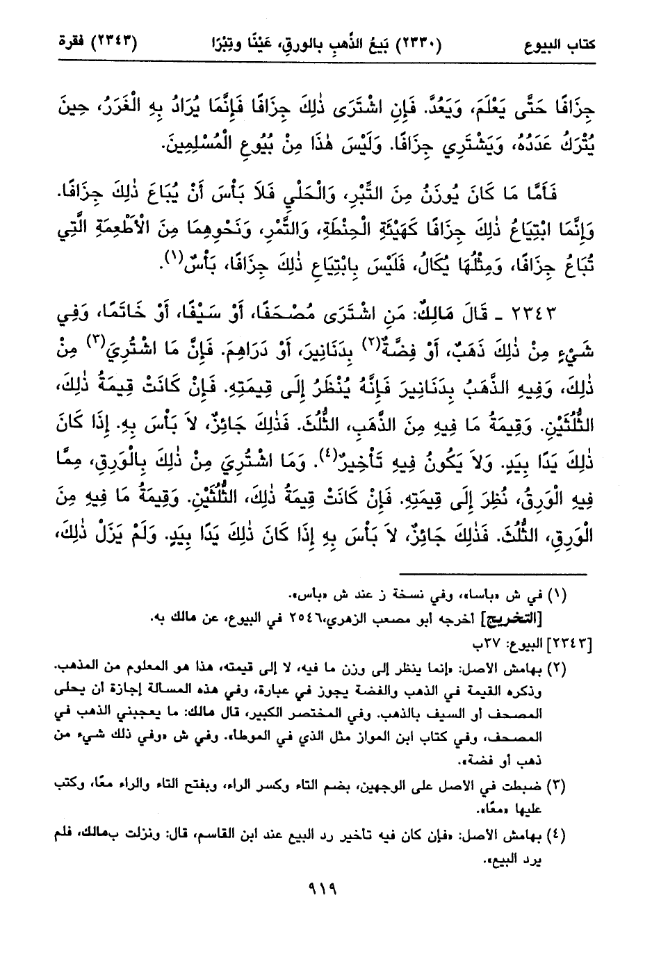 ٢٣٤٣ - قَالَ مَالِكٌ: مَنِ اشْتَرَى مُصْحَفاً، أَوْ سَيْفاً، أَوْ خَاتَماً، وَفِي شَيْءٍ مِنْ ذلِكَ ذَهَبٌ، أَوْ فِضَّةٌ (١) بِدَنَانِيرَ، أَوْ دَرَاهِمَ. فَإِنَّ مَا اشْتُرِيَ (٢) مِنْ ذلِكَ، وَفِيهِ الذَّهَبُ بِدَنَانِيرَ فَإِنَّهُ يُنْظَرُ إِلَى قِيمَتِهِ. فَإِنْ كَانَتْ قِيمَةُ ذلِكَ، الثُّلُثَيْنِ. وَقِيمَةُ مَا فِيهِ مِنَ الذَّهَبِ، الثُّلُثَ. فَذلِكَ جَائِزٌ، لَا بَأْسَ بِهِ. إِذَا كَانَ ذلِكَ يَداً بِيَدٍ. وَلَا يَكُونُ فِيهِ تَأْخِيرٌ (٣). وَمَا اشْتُرِيَ مِنْ ذلِكَ بِالْوَرِقِ، مِمَّا فِيهِ الْوَرِقُ، نُظِرَ إِلَى قِيمَتِهِ. فَإِنْ كَانَتْ قِيمَةُ ذلِكَ، الثُّلُثَيْنِ. وَقِيمَةُ مَا فِيهِ مِنَ الْوَرِقِ، الثُّلُثَ. فَذلِكَ جَائِزٌ، لَا بَأْسَ بِهِ إِذَا كَانَ ذلِكَ يَداً بِيَدٍ. وَلَمْ يَزَلْ ذلِكَ، ٍ ⦗٩٢٠⦘ مِنْ أَمْرِ (٤) النَّاسِ عِنْدَنَا.
