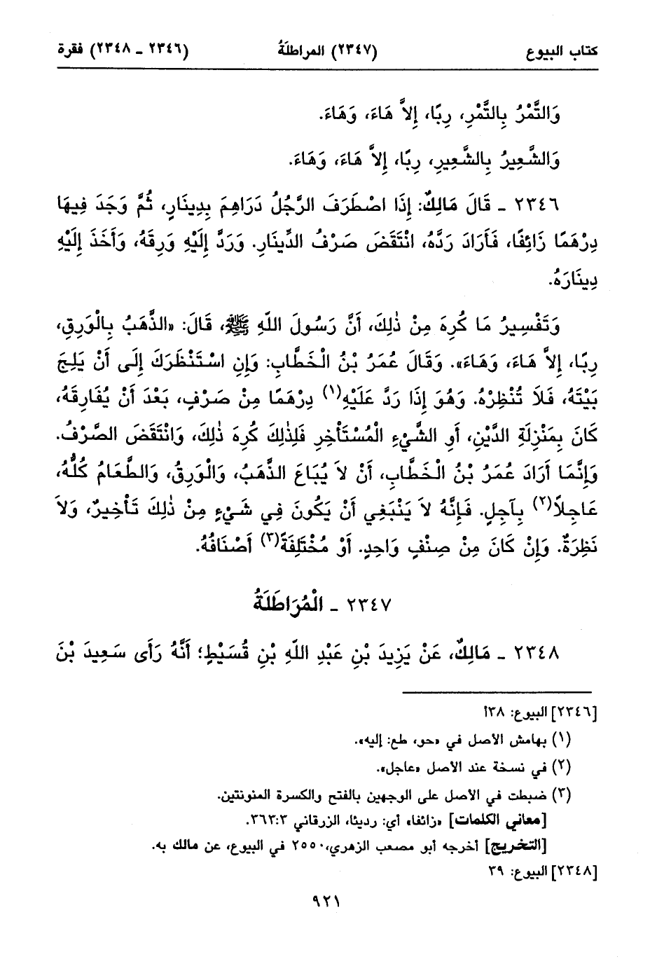 وَتَفْسِيرُ مَا كُرِهَ مِنْ ذلِكَ، أَنَّ رَسُولَ اللهِ صلى الله عليه وسلم، قَالَ: «الذَّهَبُ بِالْوَرِقِ، رِباً، إِلَاّ هَاءَ، وَهَاءَ». وَقَالَ عُمَرُ بْنُ الْخَطَّابِ: وَإِنِ اسْتَنْظَرَكَ إِلَى أَنْ يَلِجَ بَيْتَهُ، فَلَا تُنْظِرْهُ. وَهُوَ إِذَا رَدَّ عَلَيْهِ (١) دِرْهَماً مِنْ صَرْفٍ، بَعْدَ أَنْ يُفَارِقَهُ، كَانَ بِمَنْزِلَةِ الدَّيْنِ، أَوِ الشَّيْءِ الْمُسْتَأْخِرِ فَلِذلِكَ كُرِهَ ذلِكَ، وَانْتَقَضَ الصَّرْفُ. وَإِنَّمَا أَرَادَ عُمَرُ بْنُ الْخَطَّابِ، أَنْ لَا يُبَاعَ الذَّهَبُ، وَالْوَرِقُ، وَالطَّعَامُ كُلُّهُ، عَاجِلاً (٢) بِآجِلٍ. فَإِنَّهُ لَا يَنْبَغِي أَنْ يَكُونَ فِي شَيْءٍ مِنْ ذلِكَ تَأْخِيرٌ، وَلَا نَظِرَةٌ. وَإِنْ كَانَ مِنْ صِنْفٍ وَاحِدٍ. أَوْ مُخْتَلِفَةً (٣) أَصْنَافُهُ.