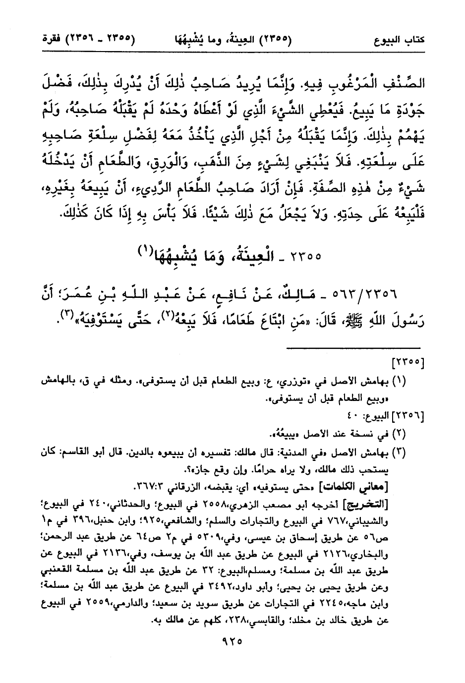 ٢٣٥٦/ ٥٦٣ - مَالِكٌ، عَنْ نَافِعٍ، عَنْ عَبْدِ اللهِ بْنِ عُمَرَ؛ أَنَّ رَسُولَ اللهِ صلى الله عليه وسلم، قَالَ: «مَنِ ابْتَاعَ طَعَاماً، فَلَا يَبِعْهُ (١)، حَتَّى يَسْتَوْفِيَهُ» (٢).