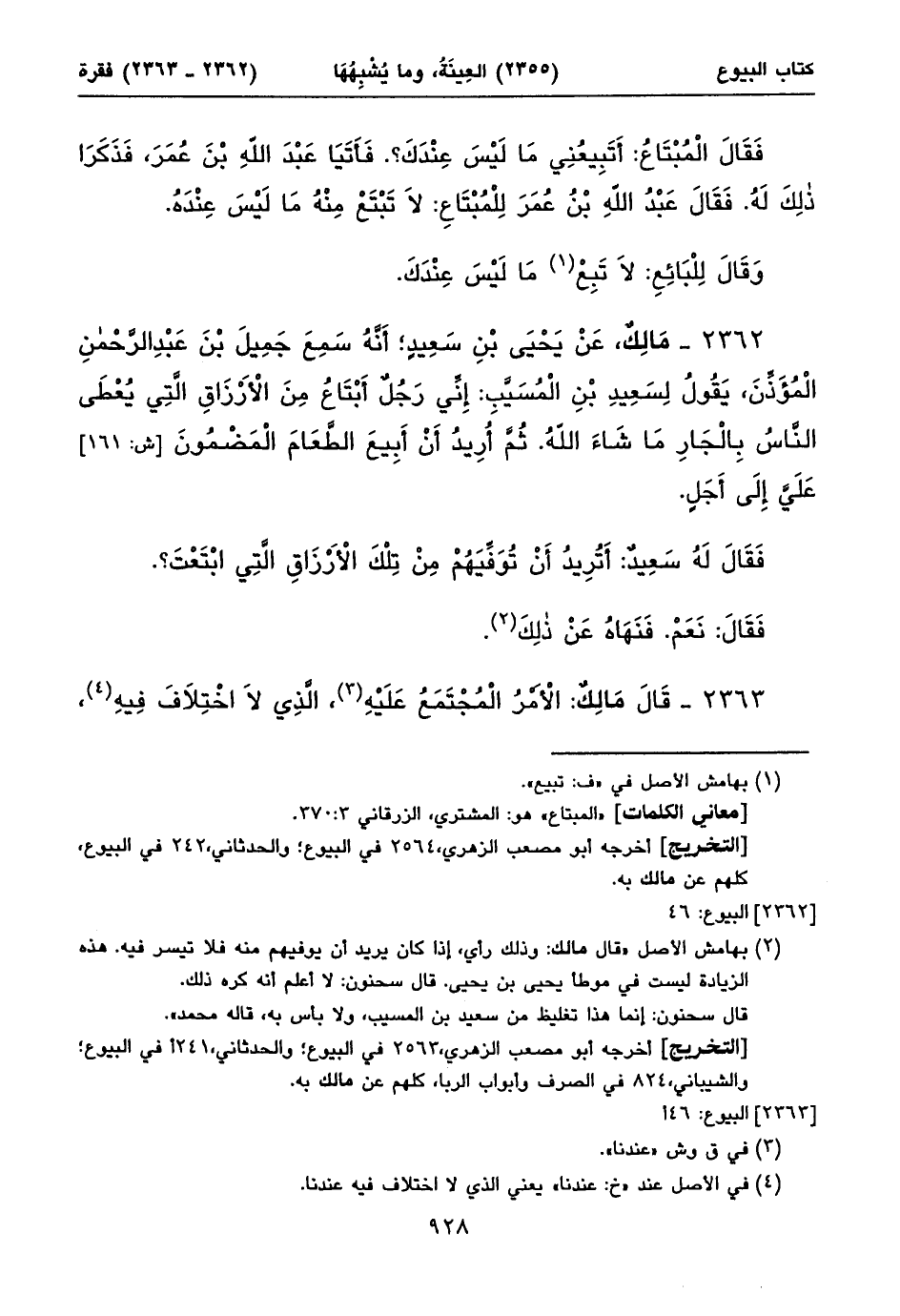 ٢٣٦٣ - قَالَ مَالِكٌ: الْأَمْرُ الْمُجْتَمَعُ عَلَيْهِ (١)، الَّذِي لَا اخْتِلَافَ فِيهِ (٢)، ⦗٩٢٩⦘ أَنَّهُ مَنِ اشْتَرَى طَعَاماً، بُرّاً، أَوْ شَعِيراً، أَوْ سُلْتاً، أَوْ ذُرَةً، أَوْ دُخْناً. أَوْ شَيْئاً مِنَ الْحُبُوبِ الْقِطْنِيَّةِ. أَوْ شَيْئاً مِمَّا يُشْبِهُ الْقِطْنِيَّةِ. مِمَّا تَجِبُ فِيهِ الزَّكَاةُ. أَوْ شَيْئاً مِنَ الْأُدُمِ كُلِّهَا: الزَّيْتِ، وَالسَّمْنِ، وَالْعَسَلِ، وَالْخَلِّ، وَالْجُبْنِ، وَالْلَبَنِ، وَالشِّبْرَقِ، وَمَا أَشْبَهَ (٣) ذلِكَ مِنَ الْأُدْمِ. فَإِنَّ الْمُبْتَاعَ لَا يَبِيعُ شَيْئاً مِنْ ذلِكَ حَتَّى يَقْبِضَهُ، وَيَسْتَوْفِيَهُ.