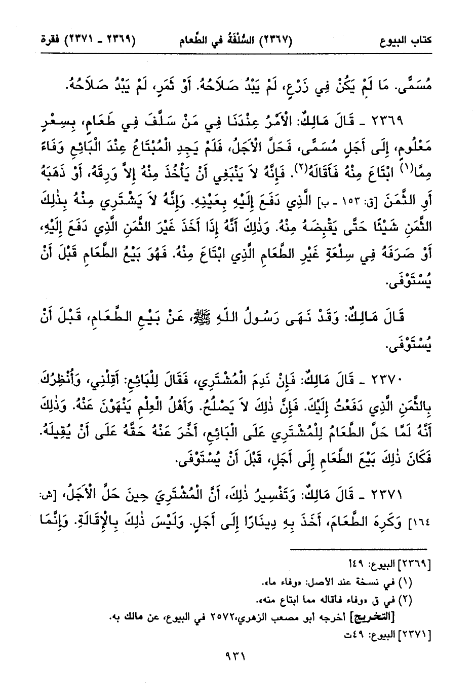 (٢) بهامش الأصل: «قال مالك: وإن أراد الذي عليه الطعام أن يعطي صاحبه سوى الطعام الذي واصفه عليه، قبل محل الأجل، فإن ذلك لا يصلح. لأن ذلك بيع الطعام قبل أن يستوفي، فإن لم يجد المشتري عند البائع إلا بعض ما سلفه فيه فأراد أن يستوفي ما وجد بسعره ويقبله مما لم يجد عنده، ويأخذ منه بحساب ذلك الثمن الذي دفع إليه، فإن ذلك لا يصلح، وهو مما ينهى عنه أهل العلم، وهو يشبه ما نهي عنه من البيع والسلف. ولو جاز ذلك من الناس لانطلق الرجل إلى الرجل يسلفه في طعام وزاده في السلف لأنه يزيده البائع في السعر، والمبتاع يعلم أنه ليس عند البائع الذي باعه من الطعام ما باعه وليس عنده وفاء بما يسلفه فيه، فإذا حلّ الأجل أخذ منه ما وجد عنده من الطعام بحسابه من الثمن، وأقاله مما لم يجد عنده، فكان ذلك بيعاً وسلفاً، وصار ذلك ذريعة بين الناس فيما نهي عنه من البيع والسلف. في موطأ ابن القاسم وابن نافع، ومطرف، وابن بكير».