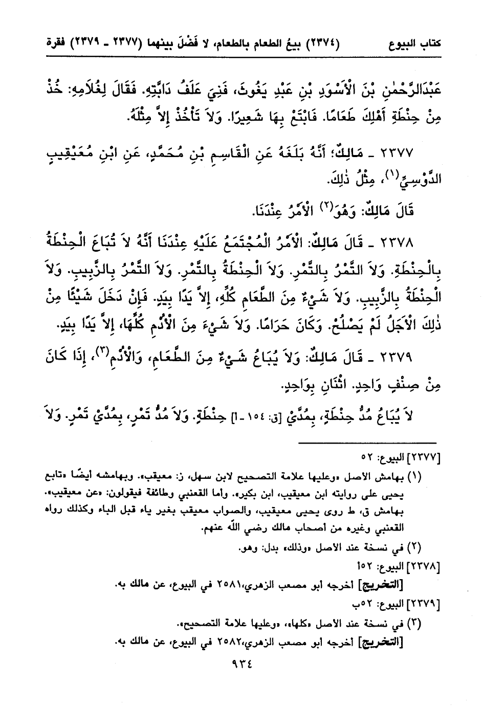 ٢٣٧٨ - قَالَ مَالِكٌ: الْأَمْرُ الْمُجْتَمَعُ عَلَيْهِ عِنْدَنَا أَنَّهُ لَا تُبَاعَ الْحِنْطَةُ بِالْحِنْطَةِ. وَلَا التَّمْرُ بِالتَّمْرِ. وَلَا الْحِنْطَةُ بِالتَّمْرِ. وَلَا التَّمْرُ بِالزَّبِيبِ. وَلَا الْحِنْطَةُ بِالزَّبِيبِ. وَلَا شَيْءٌ مِنَ الطَّعَامِ كُلِّهِ، إِلَاّ يَداً بِيَدٍ. فَإِنْ دَخَلَ شَيْئاً مِنْ ذلِكَ الْأَجَلُ لَمْ يَصْلُحْ. وَكَانَ حَرَاماً. وَلَا شَيْءَ مِنَ الْأُدْمِ كُلِّهَا، إِلَاّ يَداً بِيَدٍ.