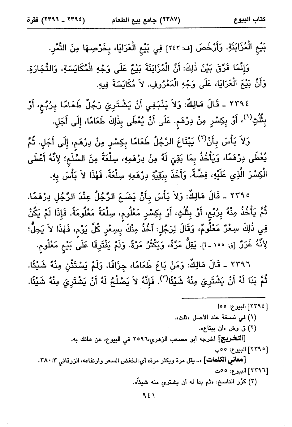 ٢٣٩٤ - قَالَ مَالِكٌ: وَلَا يَنْبَغِي أَنْ يَشْتَرِيَ رَجُلٌ طَعَاماً بِرُبُعٍ، أَوْ بِثُلُثٍ (١)، أَوْ بِكِسْرٍ مِنْ دِرْهَمٍ. عَلَى أَنْ يُعْطَى بِذلِكَ طَعَاماً، إِلَى أَجَلٍ.