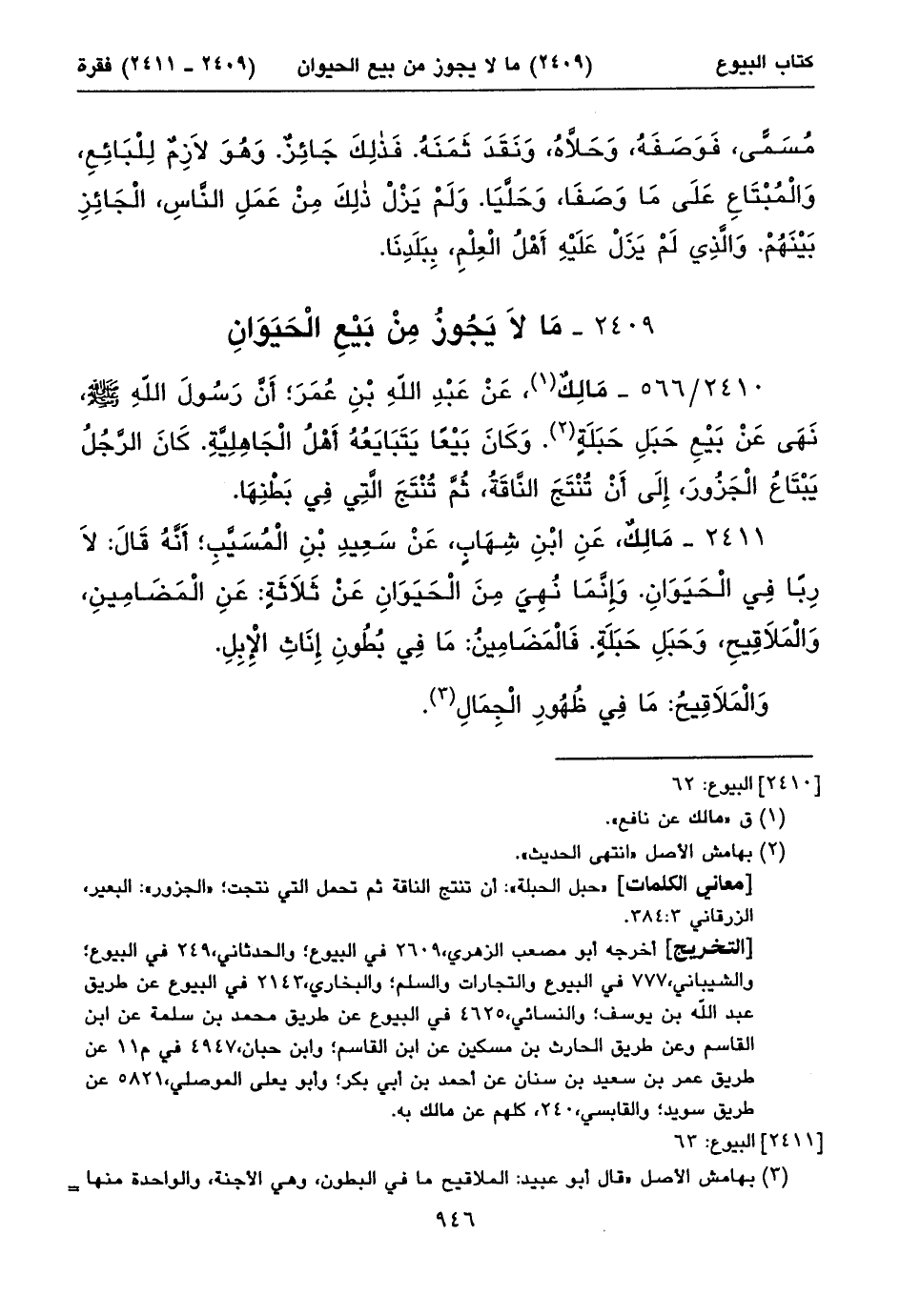 ٢٤١١ - مَالِكٌ، عَنِ ابْنِ شِهَابٍ، عَنْ سَعِيدِ بْنِ الْمُسَيَّبِ؛ أَنَّهُ قَالَ: لَا رِباً فِي الْحَيَوَانِ. وَإِنَّمَا نُهِيَ مِنَ الْحَيَوَانِ عَنْ ثَلَاثَةٍ: عَنِ الْمَضَامِينِ، وَالْمَلَاقِيحِ، وَحَبَلِ حَبَلَةٍ. فَالْمَضَامِينُ: مَا فِي بُطُونِ إِنَاثِ الْإِبِلِ.