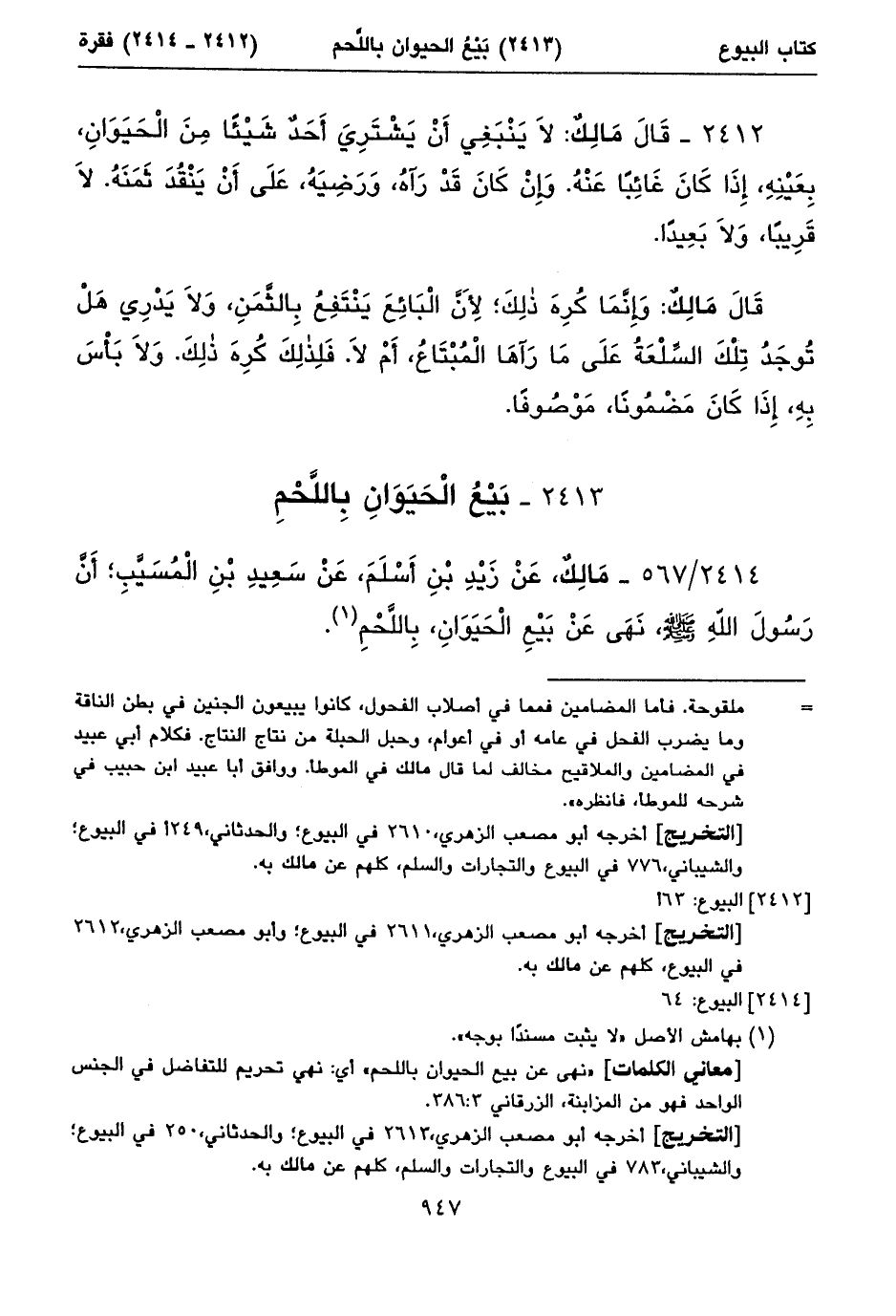 ٢٤١٤/ ٥٦٧ - مَالِكٌ، عَنْ زَيْدِ بْنِ أَسْلَمَ، عَنْ سَعِيدِ بْنِ الْمُسَيَّبِ؛ أَنَّ رَسُولَ اللهِ صلى الله عليه وسلم، نَهَى عَنْ بَيْعِ الْحَيَوَانِ، بِاللَّحْمِ (١).