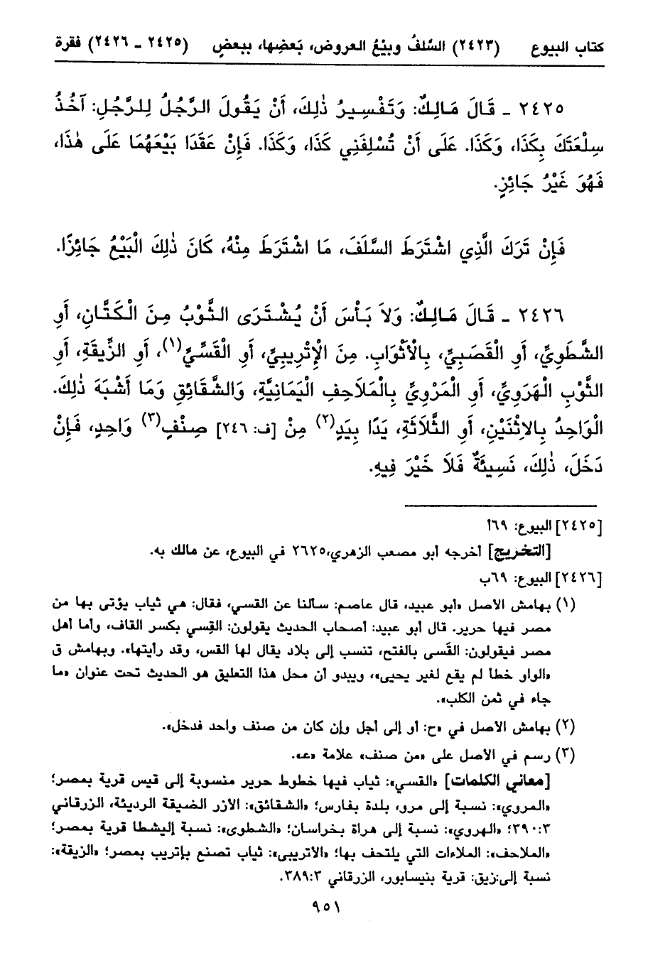 ٢٤٢٦ - قَالَ مَالِكٌ: وَلَا بَأْسَ أَنْ يُشْتَرَى الثَّوْبُ مِنَ الْكَتَّانِ، أَوِ الشَّطَوِيِّ، أَوِ الْقَصَبِيِّ، بِالْأَثْوَابِ. مِنَ الْإِتْرِيبِيِّ، أَوِ الْقَسِّيِّ (١)، أَوِ الزِّيقَةِ، أَوِ الثَّوْبِ الْهَرَوِيِّ، أَوِ الْمَرْوِيِّ بِالْمَلَاحِفِ الْيَمَانِيَّةِ، وَالشَّقَائِقِ وَمَا أَشْبَهَ ذلِكَ. الْوَاحِدُ بِالِاثْنَيْنِ، أَوِ الثَّلَاثَةِ، يَداً بِيَدٍ (٢) مِنْ [ف: ٢٤٦] صِنْفٍ (٣) وَاحِدٍ، فَإِنْ دَخَلَ، ذلِكَ، نَسِيئَةٌ فَلَا خَيْرَ فِيهِ.
