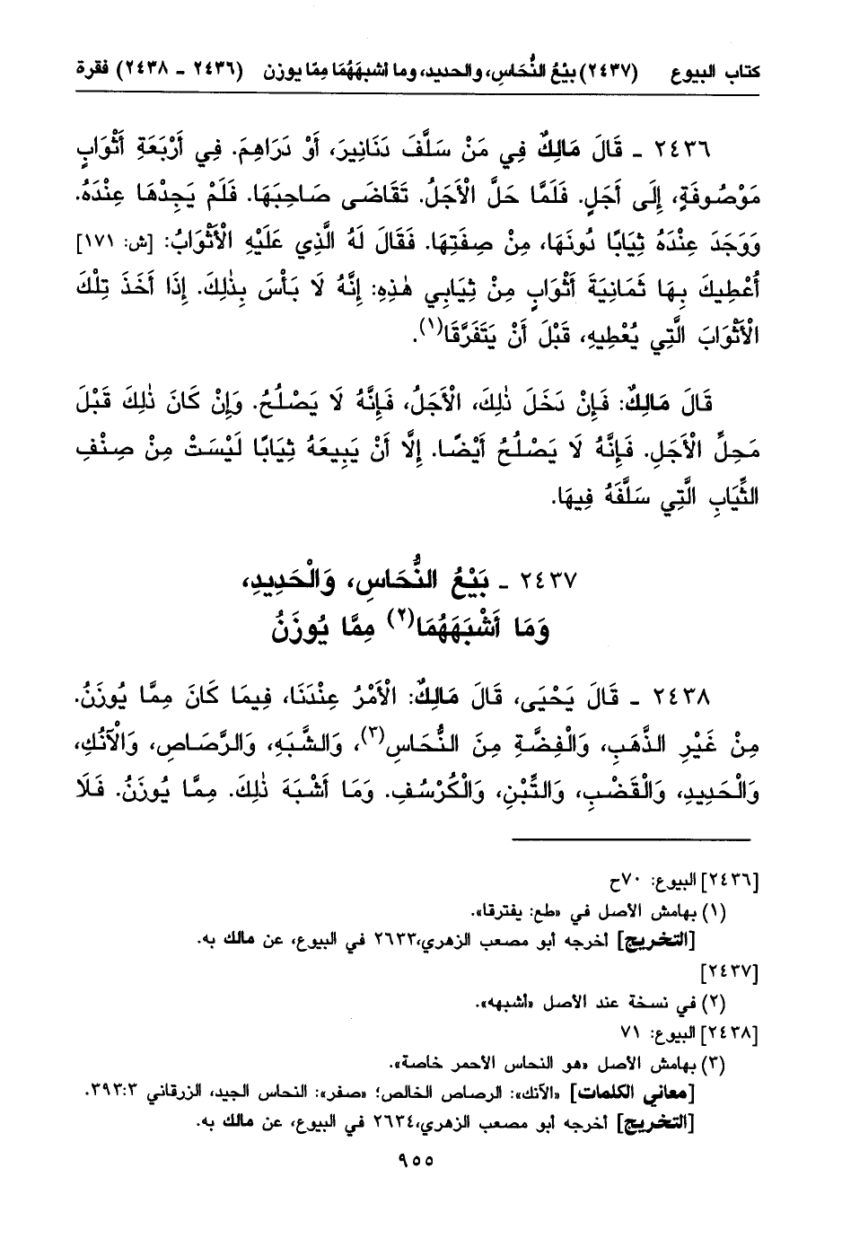 ٢٤٣٨ - قَالَ يَحْيَى، قَالَ مَالِكٌ: الْأَمْرُ عِنْدَنَا، فِيمَا كَانَ مِمَّا يُوزَنُ. مِنْ غَيْرِ الذَّهَبِ، وَالْفِضَّةِ مِنَ النُّحَاسِ (١)، وَالشَّبَهِ، وَالرَّصَاصِ، وَالْآنُكِ، وَالْحَدِيدِ، وَالْقَضْبِ، وَالتِّبْنِ، وَالْكُرْسُفِ. وَمَا أَشْبَهَ ذلِكَ. مِمَّا يُوزَنُ. فَلَا ⦗٩٥٦⦘ بَأْسَ بِأَنْ يُؤْخَذَ مِنْ صِنْفٍ وَاحِدٍ. اثْنَانِ، بِوَاحِدٍ، يَداً بِيَدٍ. لَا بَأْسَ بِأَنْ يُؤْخَذَ رِطْلُ حَدِيدٍ، بِرِطْلَيْ حَدِيدٍ. وَرِطْلُ صُفْرٍ، بِرِطْلَيْ صُفْرٍ.