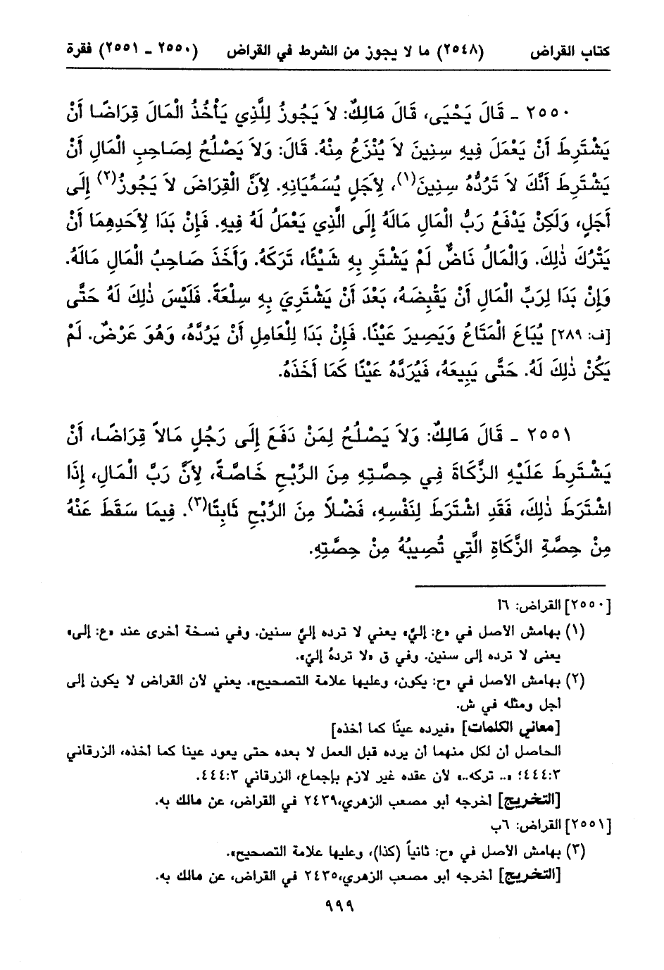 ٢٥٥٠ - قَالَ يَحْيَى، قَالَ مَالِكٌ: لَا يَجُوزُ لِلَّذِي يَأْخُذُ الْمَالَ قِرَاضاً أَنْ يَشْتَرِطَ أَنْ يَعْمَلَ فِيهِ سِنِينَ لَا يُنْزَعُ مِنْهُ. قَالَ: وَلَا يَصْلُحُ لِصَاحِبِ الْمَالِ أَنْ يَشْتَرِطَ أَنَّكَ لَا تَرُدُّهُ سِنِينَ (١)، لِأَجَلٍ يُسَمِّيَانِهِ. لِأَنَّ الْقِرَاضَ لَا يَجُوزُ (٢) إِلَى أَجَلٍ، وَلَكِنْ يَدْفَعُ رَبُّ الْمَالِ مَالَهُ إِلَى الَّذِي يَعْمَلُ لَهُ فِيهِ. فَإِنْ بَدَا لِأَحَدِهِمَا أَنْ يَتْرُكَ ذلِكَ. وَالْمَالُ نَاضٌّ لَمْ يَشْتَرِ بِهِ شَيْئاً، تَرَكَهُ. وَأَخَذَ صَاحِبُ الْمَالِ مَالَهُ. وَإِنْ بَدَا لِرَبِّ الْمَالِ أَنْ يَقْبِضَهُ، بَعْدَ أَنْ يَشْتَرِيَ بِهِ سِلْعَةً. فَلَيْسَ ذلِكَ لَهُ حَتَّى [ف: ٢٨٩] يُبَاعَ الْمَتَاعُ وَيَصِيرَ عَيْناً. فَإِنْ بَدَا لِلْعَامِلِ أَنْ يَرُدَّهُ، وَهُوَ عَرْضٌ. لَمْ يَكُنْ ذلِكَ لَهُ. حَتَّى يَبِيعَهُ، فَيُرَدَّهُ عَيْناً كَمَا أَخَذَهُ.