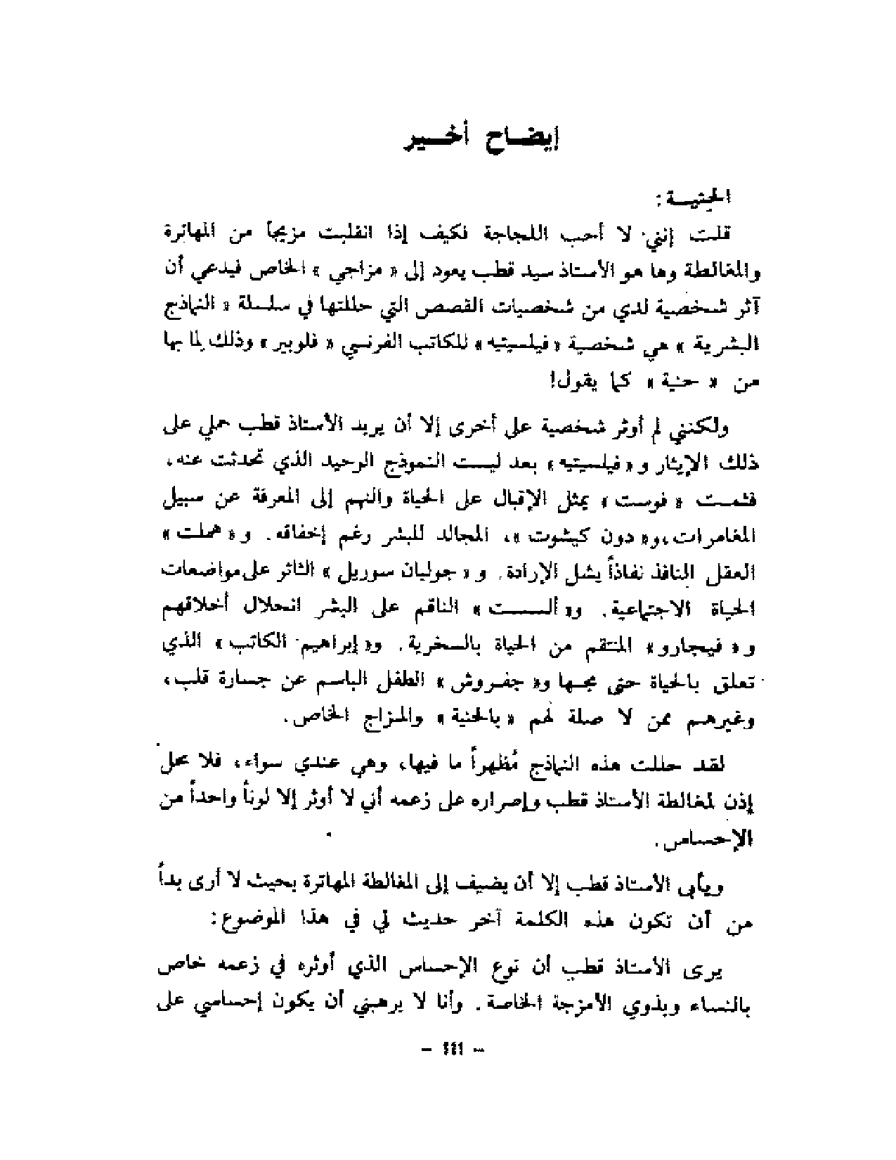 وكل تلك الأبحاث على اختلافها في الإصابة بعيدة فيما أحسب عن الحقيقة النفسية الثابتة وعن تمايز النفوس تمايزا لا يمكن أن ينال منه -بخاصة في النفوس الأصيلة- أي وحدة في الجنس أو الزمان أو المكان أو الثقافة، أو غير ذلك مما زعمه "تين" وغير "تين" من النقاد الشكليين، الذين فهموا كل شيء غير أصالة النفوس، واختلاف طرق انفعالها بما يحيطها من ناس وأشياء، بل بما يدور في حناياها من حس أو شعور أو فكر.