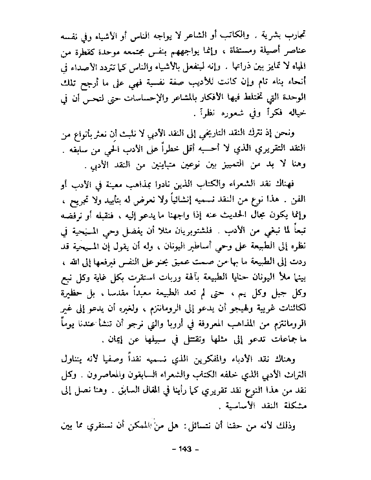 المنثور في كتاب الأغاني وغيره كتب نقد منهجي مفصل لا نظن أن الأوربيين قد وضعوا في آدابهم خيرا منها، ومع ملاحظة الفارق بين طبيعة أدبنا وآدابهم، وخير مثل لتلك الكتب هو "الموازنة" و"الوساطة" ففي أولهما يتناول الآمدي البحتري وأبا تمام بالدرس التفصيلي والمقارنة المستقصاة وفق منهج وضحته في كتاب أرجو أن يقرأه الناس قريبا1، وفي ثانيهما فعل عبد العزيز الجرجاني كذلك في دراسته للمتنبي.
