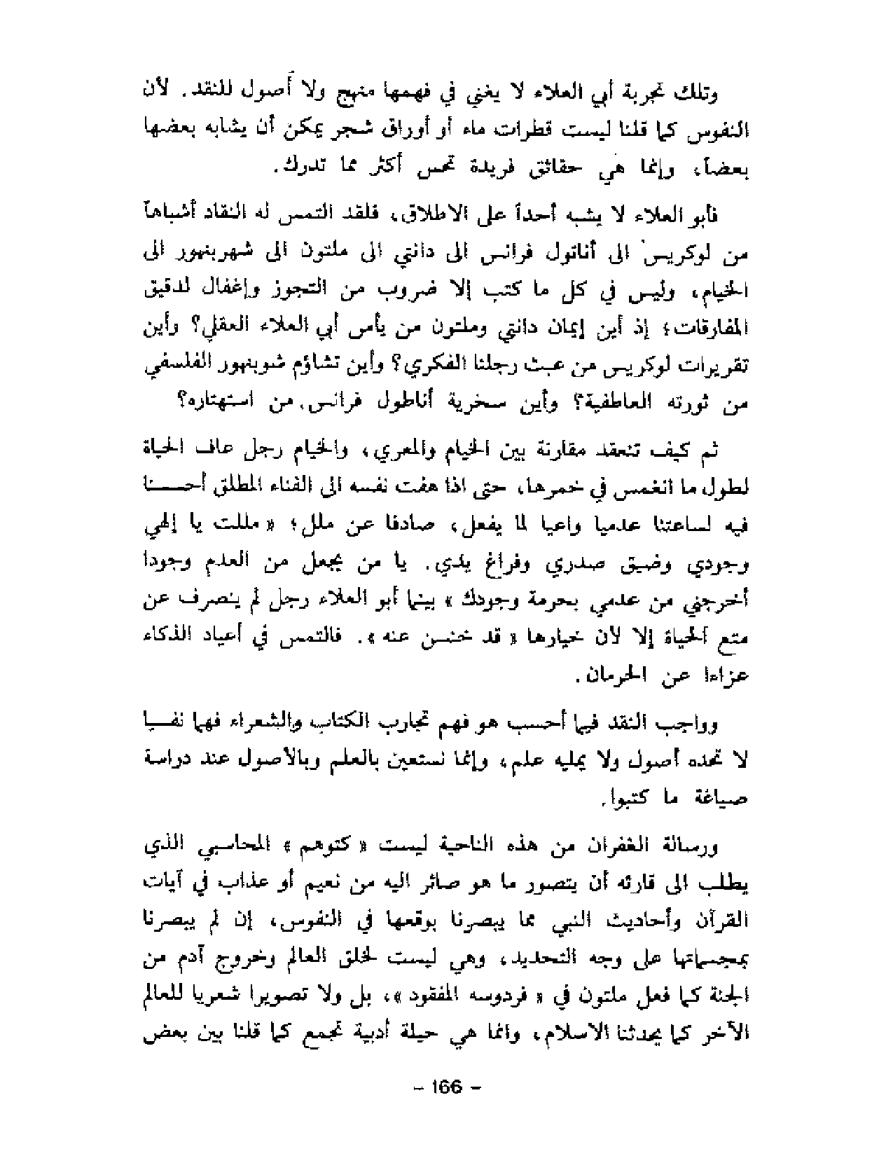 أي نفع لبلادنا بل لأنفسنا في أن ندعي أن التأليف ويكون عملنا هو عدم أمانة في الترجمة، نترجم ما يسهل علينا فهمه ونهمل ما يشق، ثم ننثر حول النص الأوربي شيئا من هذياننا الشخصي، وبعد ذلك نعدي أننا قد ألفنا كتبا. ومن يستطيع في هذا البلد أن يدرك أصالتك -إن كانت لك أصالة- وأنت تتكلم عن نصوص ومؤلفين ومؤلفات مجهولة من الجميع.