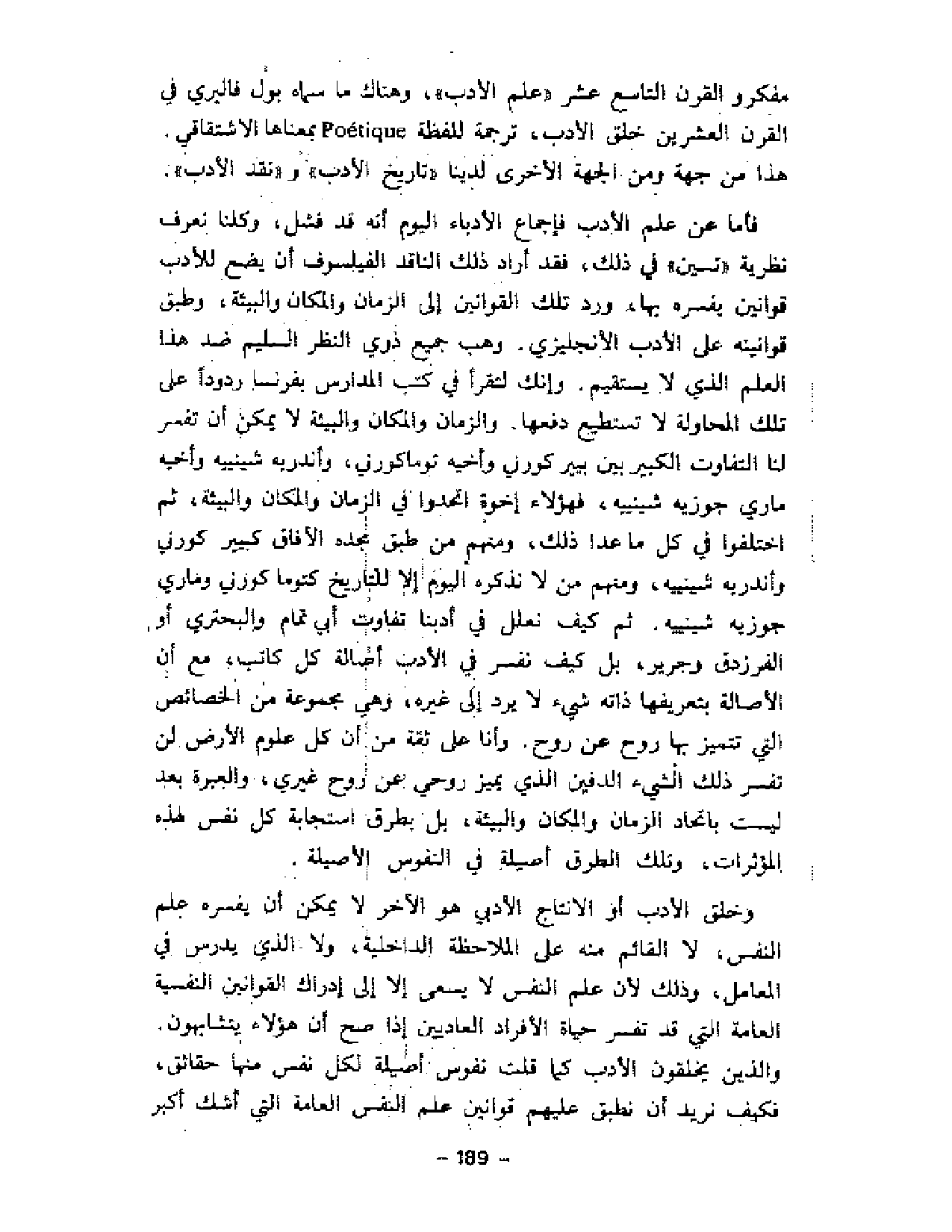 ولكننا لا نكاد نترك وجود التفاعيل إلى بنية تلك التفاعيل حتى نختلف مع الخليل؛ وذلك لأنه لم يدلنا على وحدة الكلام وهي المقطع، وأكبر ظني أن الخليل لم يعرف العروض اليوناني، وإلا لفطن إلى المقطع، وإن يكن قد علم -فيما نرجح- بالموسيقى اليونانية بفرعيها: "علم الإيقاع rythmique وعلم الانسجام Les harmoniques" "والعروض اليوناني كما هو معلوم يقوم على المقطع، والسبب الذي منه الخليل من الوقوع على المقطع مزدوج فيما أظن".