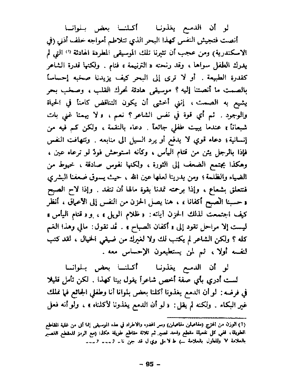 وحسبما كان لونها الدائم أو الموقوت، ونحن بعد ذلك لا نكتب لنسكب ما في نفوسنا في أنفس الغير، وإنما لنعين كل نفس على الوعي بمكنونها؛ إذ النفوس عامرة بكل حق وجمال، والمقال الجيد هو ما يأخذ بتلك النفوس إلى حيث يستقر منها ذلك الحق وذلك الجمال.