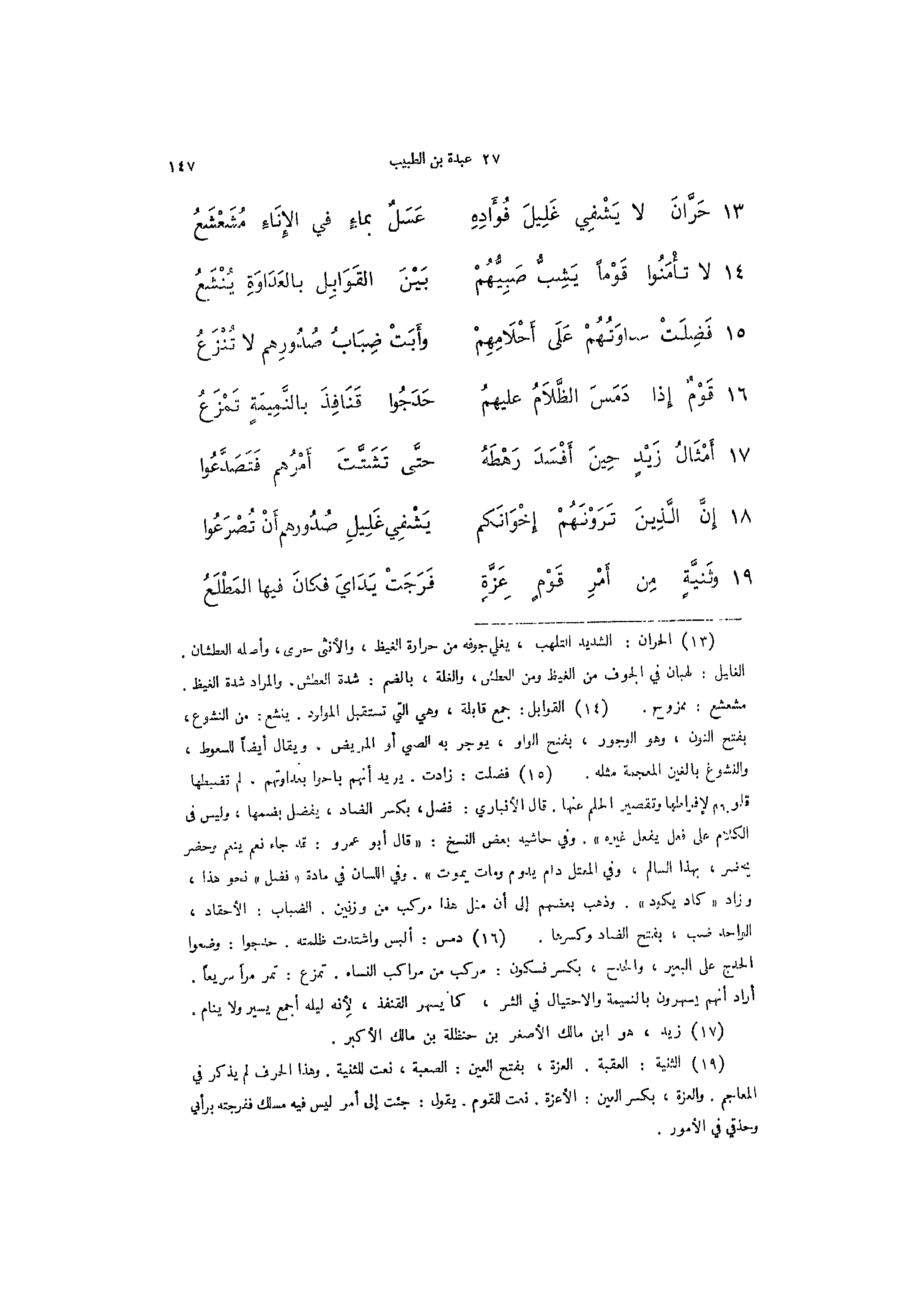 14 - (لا تأْمَنُوا قَوْماً يَشِبُّ صَبِيُّهُمْ ... بَيْنَ القَوَابِل بالعَدَاوَةِ ينشع)