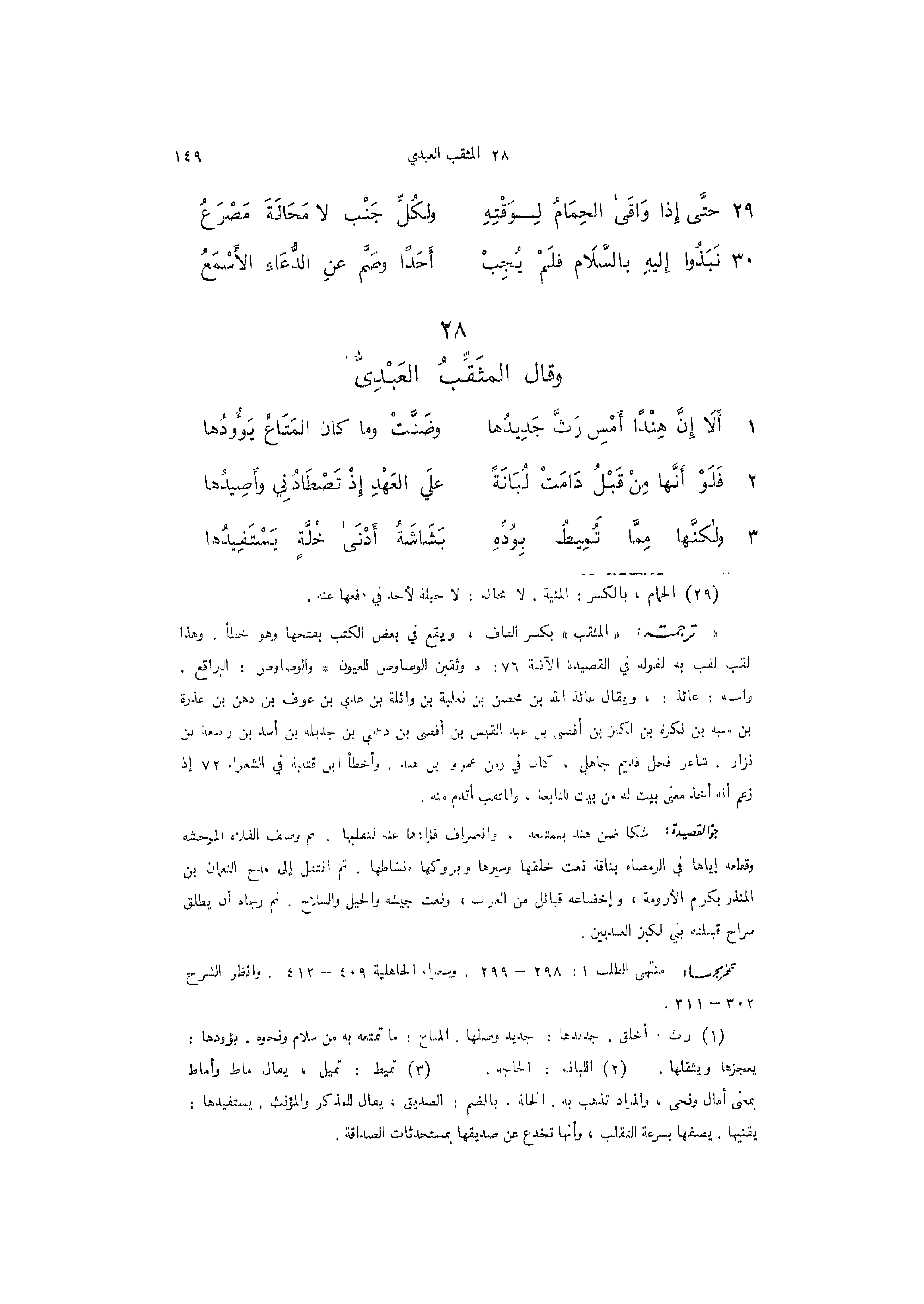 1 - (أَلاَ إِنَّ هِنْداً أَمْسِ رَثَّ جَدِيدُها ... وضَنَّتْ وما كان المَتَاعُ يؤودها)