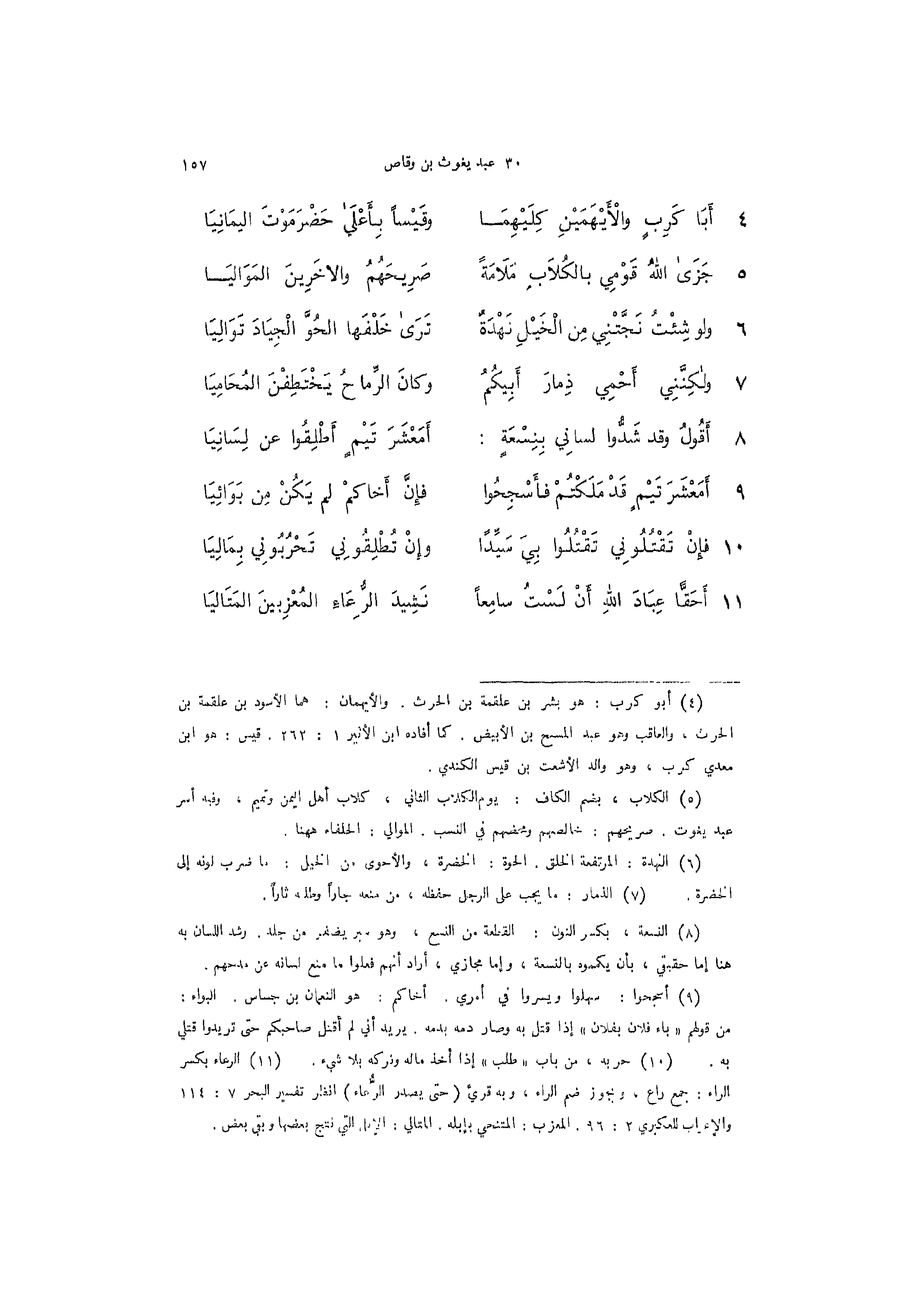 4 - (أَبَا كَرِبٍ والأَْيْهَمَيْنِ كِلَيْهِمَا ... وقَيْساً بِأَعْلَي حَضْرَمَوْتَ اليمَانِيَا)