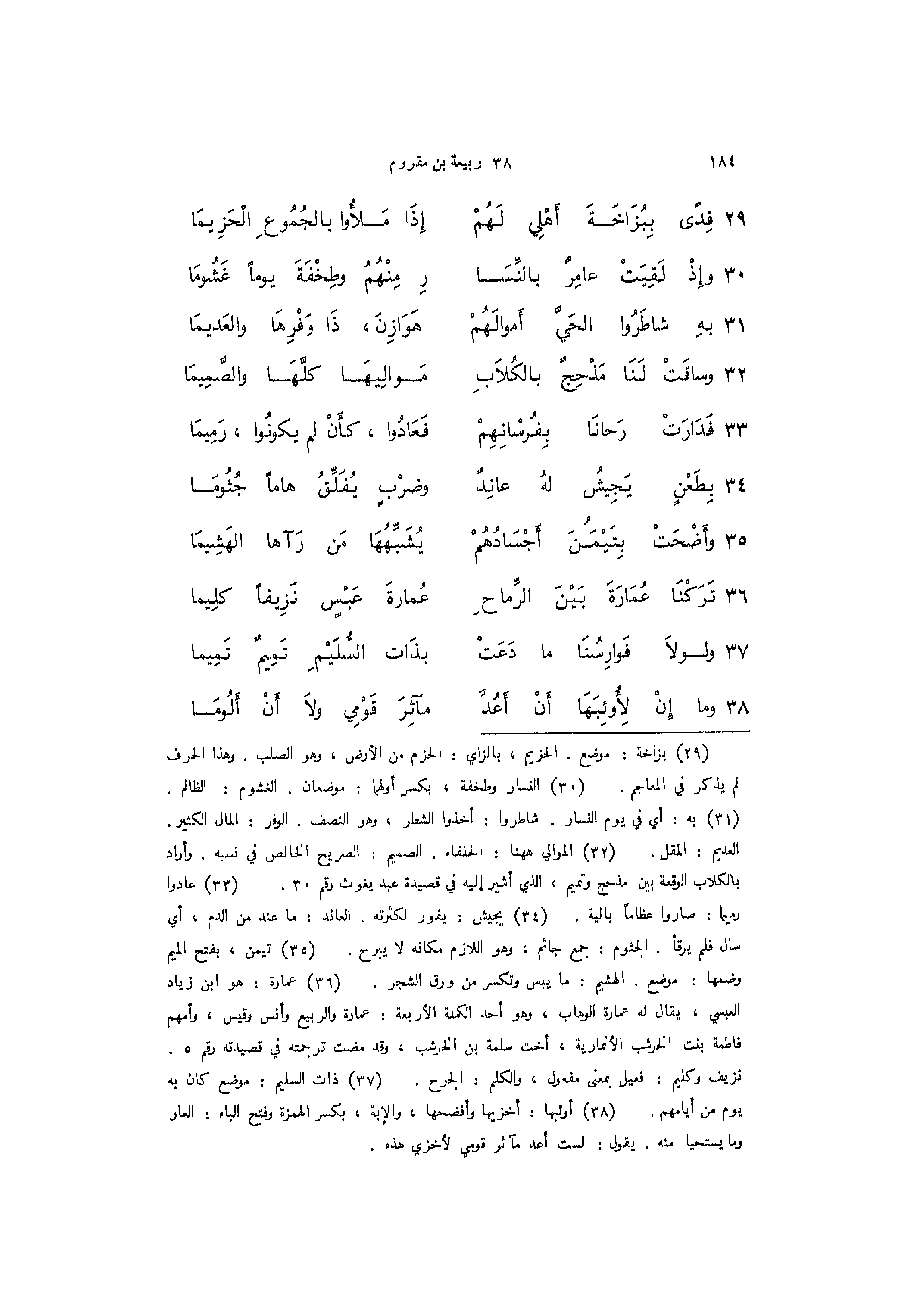 38 - (وما إِنْ لأُِوئِبَهَا أَنْ أَعُدَّ ... مآثِرَ قَوْمِي ولا أنا أَلُومَا)