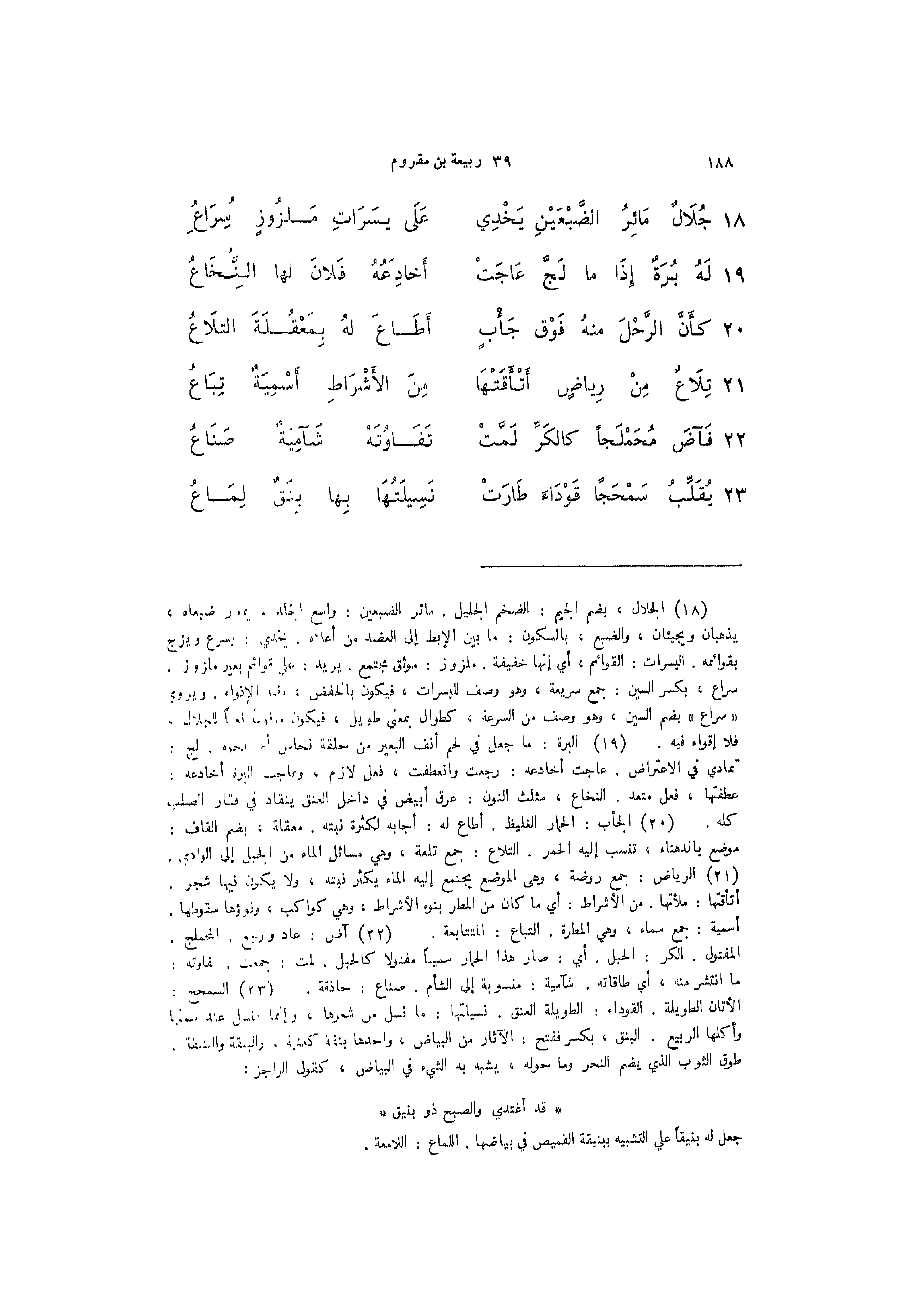 18 - (جُلاَلٌ مَائِرُ الضَّبْعَيْنِ يَخْدِي ... عَلَى يسَرَاتِ مَلزُوزٍ سِرَاعُ)