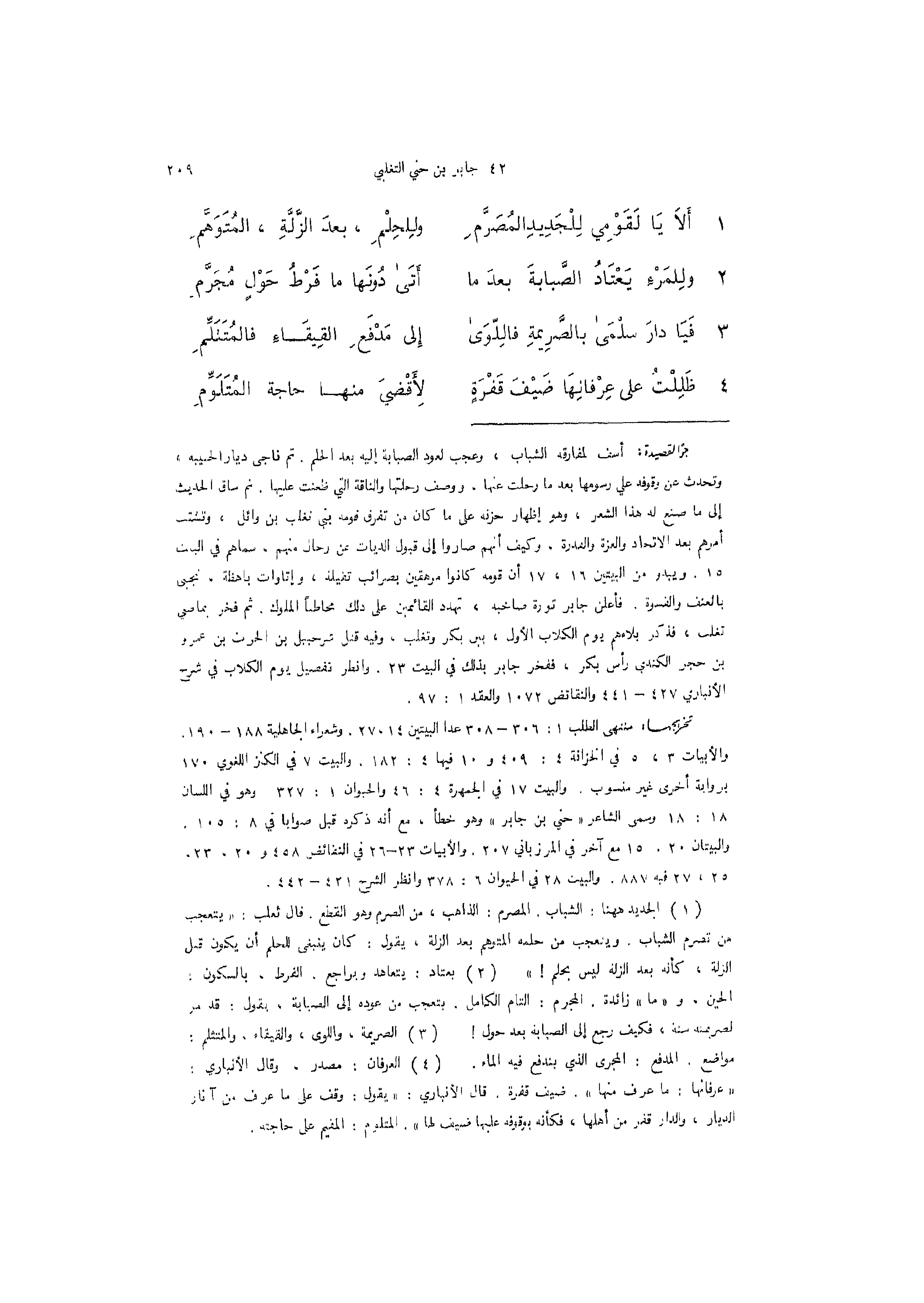 4 - (ظَلِلْتُ على عِرْفانِهَا ضَيْفَ قَفْرَةٍ ... لأَِقْضيَ منها حاجة المُتَلَوِّمِ)
