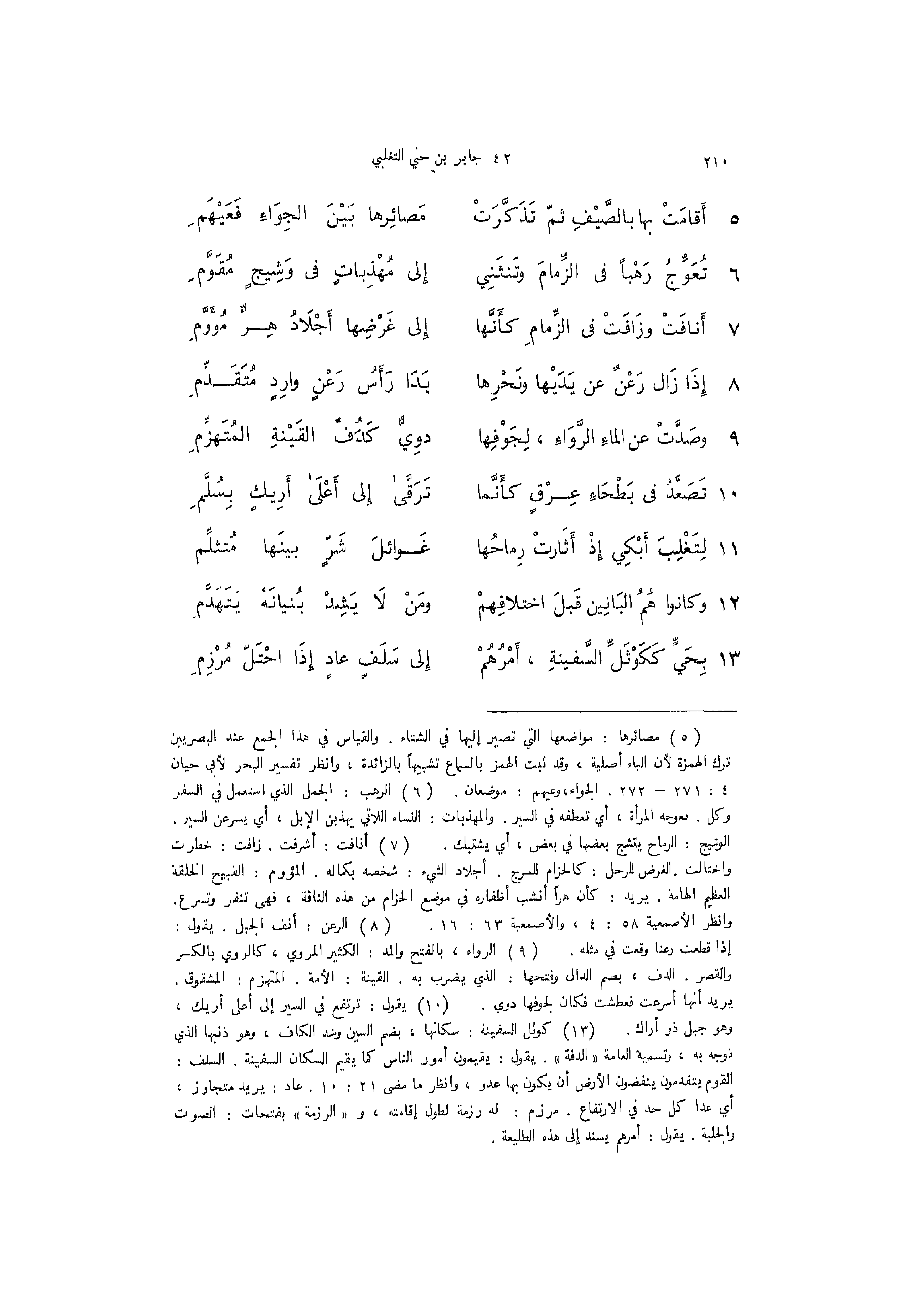 13 - (بِحَيٍّ كَكَوْثَلِّ السَّفينةِ أَمْرُهُمْ ... إِلى سَلَفٍ عادٍ إِذَا احْتَلّ مُرْزِمِ)