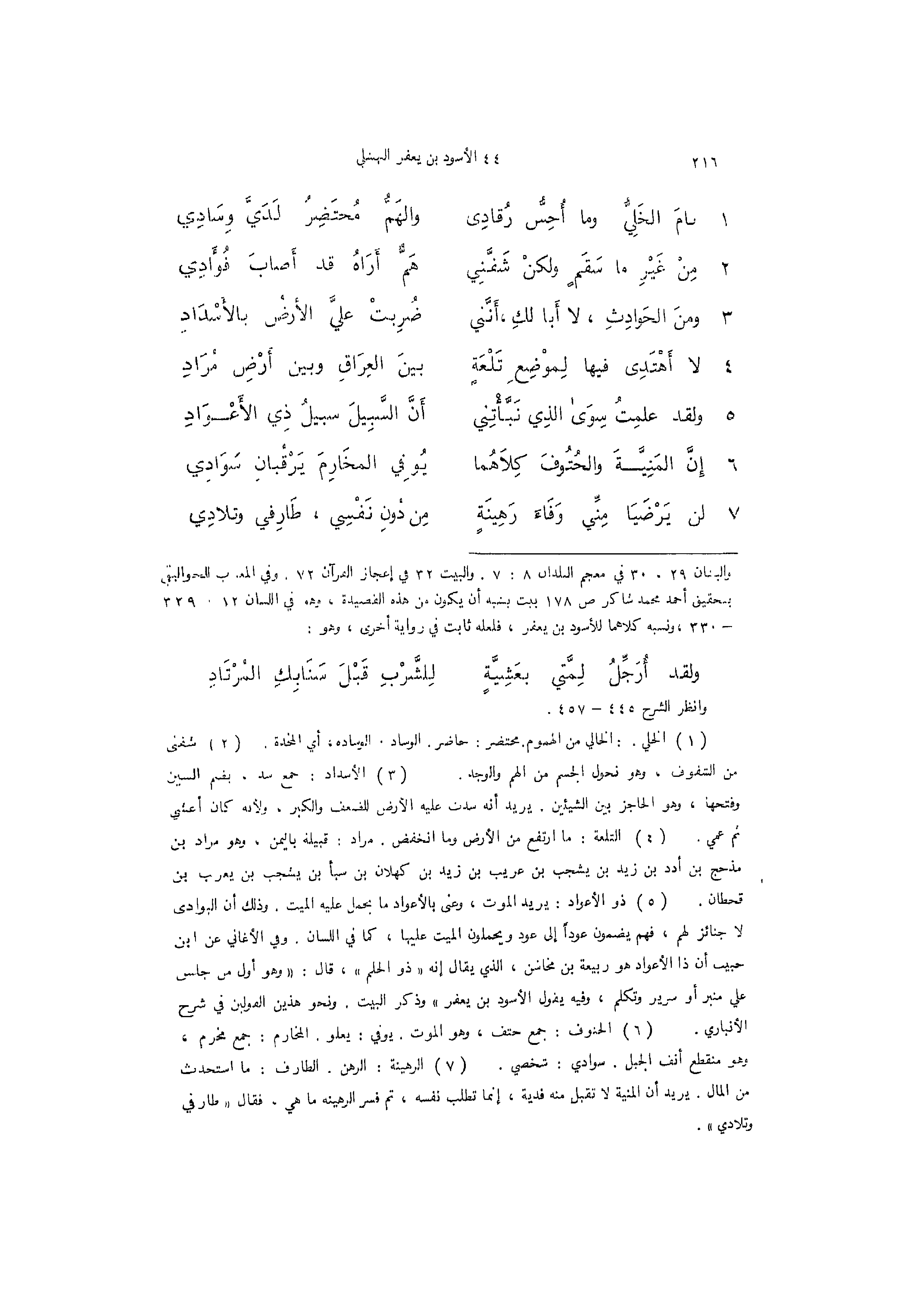 6 - (إِنَّ المَنِيَّةَ والحُتُوفَ كِلاَهُما ... يُوفِي المخَارِمَ يَرْقُبانِ سوَاَدِي ... 7