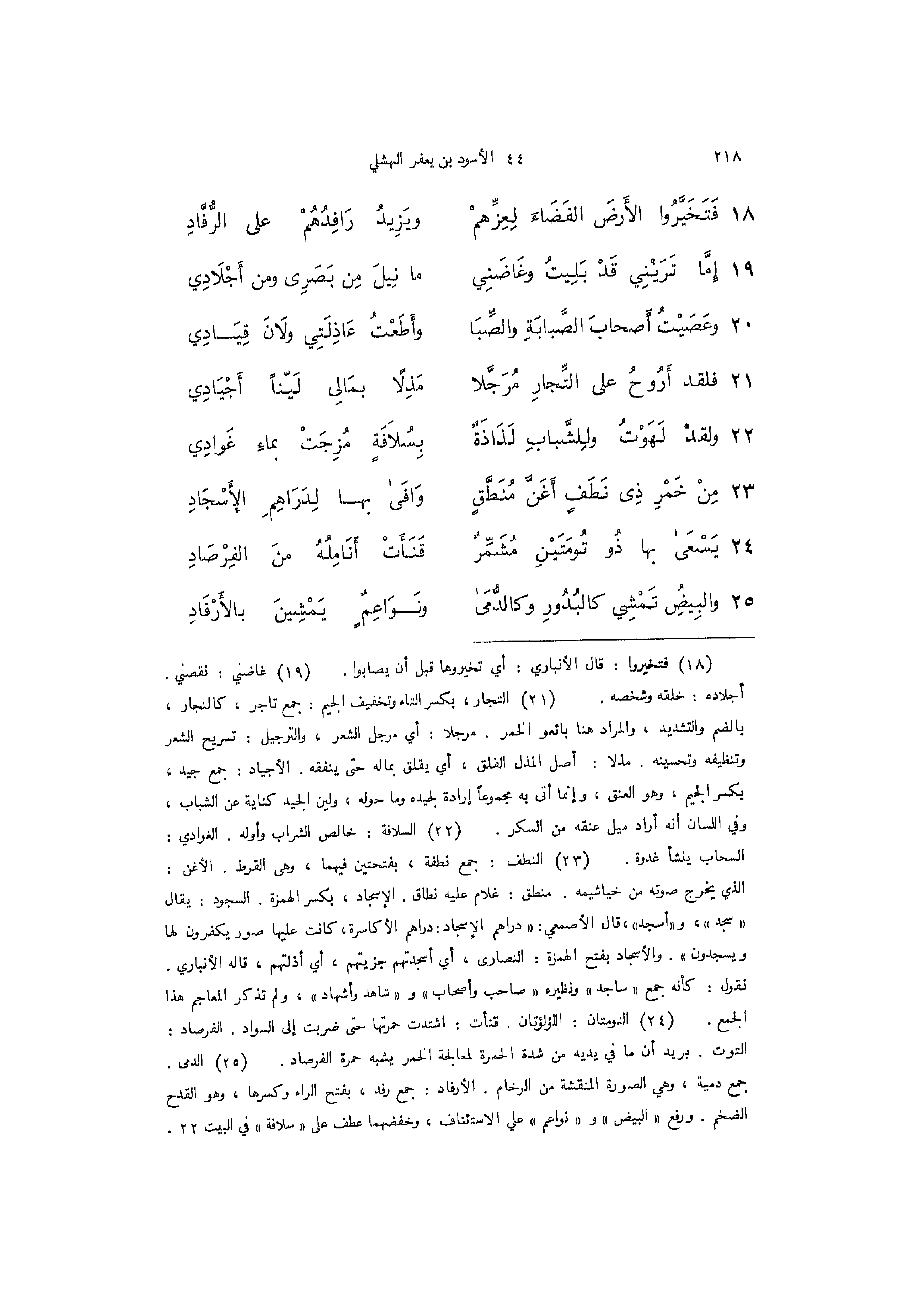 21 - (فلقد أَرُوحُ على التِّجارِ مُرَجَّلا ... مَذِلاً بمَالِى لَيِّناً أَجْيَادِي)